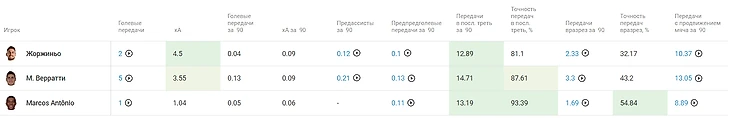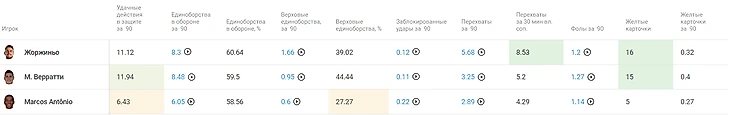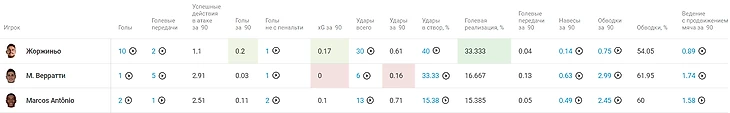 Показатели атакующих действий достаточно ровные, если не учитывать, что Жоржиньо – успешный штатный пенальтист своей команды. Но видим, что Жоржиньо практически не идет в дриблинг, в отличие от Веррати и Маркоса Антонио.