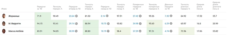 Видим, что процент точности передач у этих футболистов очень высокий. У Верратти он вообще феноменальный: при 94 передачах за игру точность достигает 93%. Также видим, что у всех троих процент точности передач вперед выше 80%. Для передач назад и поперек – выше 95%. Такие футболисты идеально впишутся в игру команды, которая заточена на контроль мяча и позиционные атаки.