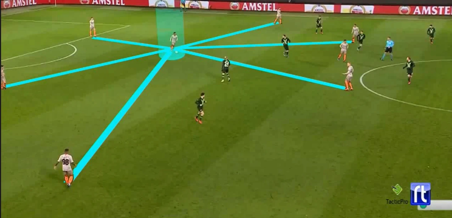 Действия Де Йонга в очередной раз разбивают оборонительные блоки. В «Аяксе» Френки играл чуть ниже, чем в «Барселоне» (есть Бускетс, из-за которого ему приходится привыкать к новой роли). Он точно смог реализовать себя и в этой позиции, но возможности и потенциал гораздо больше, если он будет играть немного ниже.