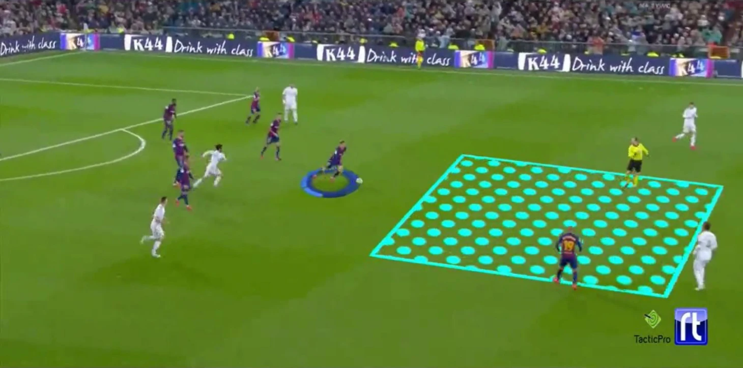 В этом эпизоде у «Реала» заняты 6 человек, а у «Барсы» – один игрок, выполняющий скоростную работу. На каждый такой эпизод футболисты соперника тратят немало сил, что дает преимущество команде Де Йонга.