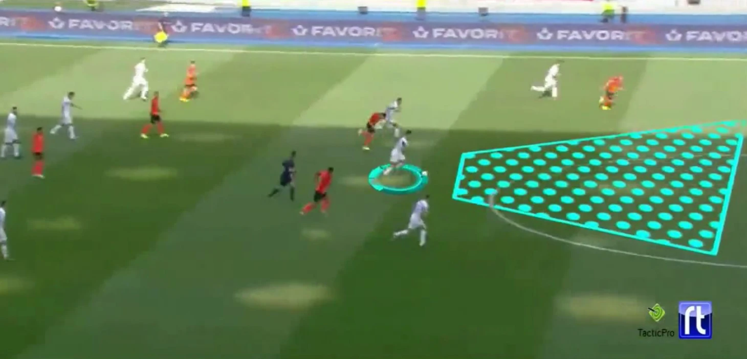 Посмотрите, какое скопление игроков. Пространства практически нет, но Матео успешно ведет мяч, разбивая оборону соперника.