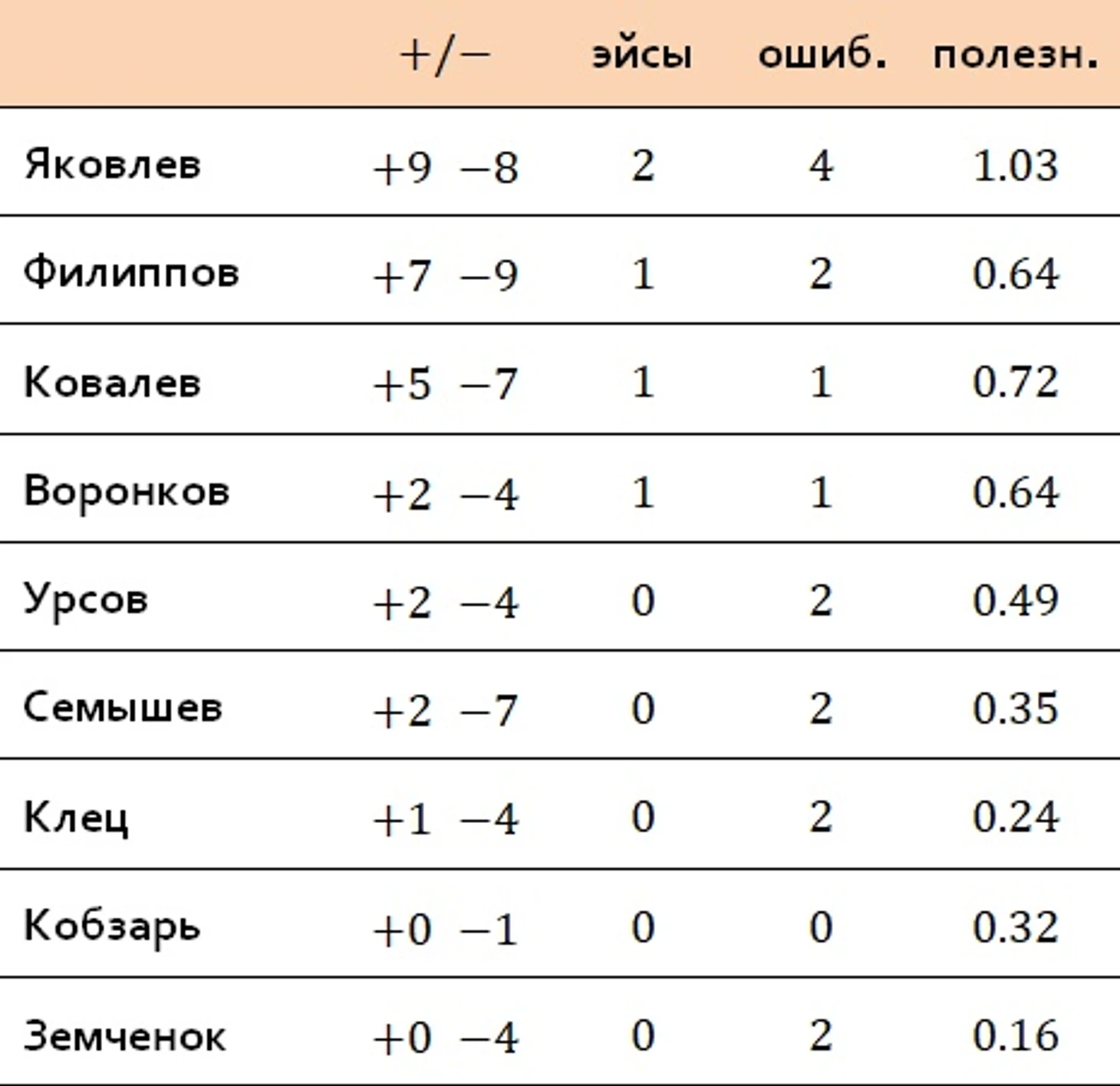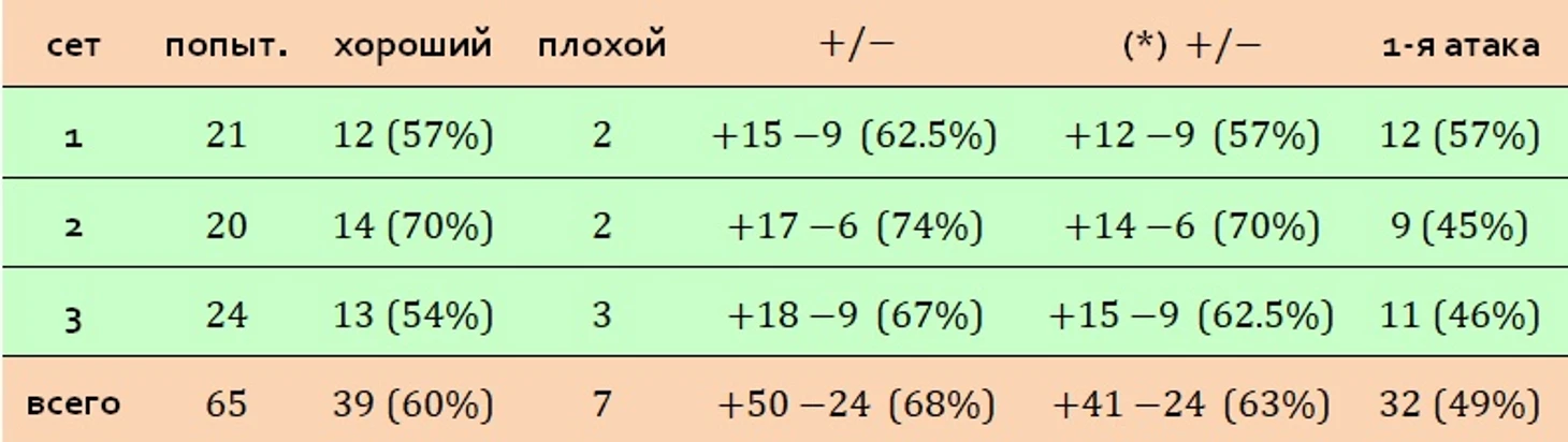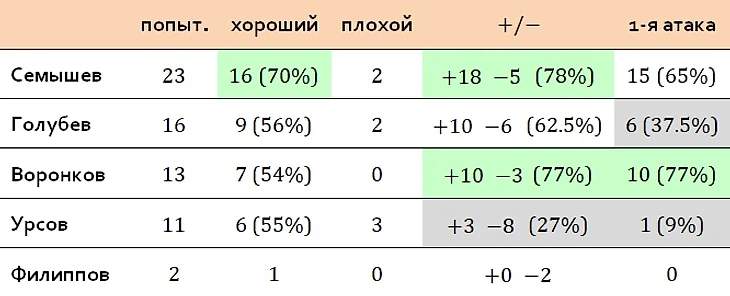 Урсова брали в сборную как одного из лучших принимающих, но первый блин вышел комом: 6 из 11 хороших попыток — вроде неплохо, но три ошибки — много. Ну и реализация первой атаки на плинтусной отметке, хотя это, конечно, зависит не только от принимающего. По-прежнему для меня загадка — приём Семышева и его перспективы в сборной в связи с этим. Триумфальные циферки против Китая не являются, конечно, надёжным признаком.