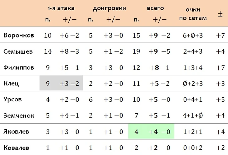 Единственный, кто мучался в атаке — Клец, но это понятно: ему вообще должно быть сложнее всех в сборной. Много проигранных атак Семышева — это не показатель чего-либо дурного, а просто его манера игры: он старается выигрывать сложные ситуации и рискует (что-то вроде Димы Волкова). Фея Воронков в отчётном матче выиграл какое-то невообразимое количество мячей скидками (кажется, три или четыре), но на этот cxn ему обольщаться не стоит. А вот два реализованных им пайпа — хороший показатель. Там всё было чётко и уверенно. Получается, что на сегодняшний день Федя для нашей сборной — очевидно полезный человек на задней линии. Почти все его недостатки — у сетки. Но захочет ли Туомас проводить его по задней линии и сможет ли сам Федя эффективно выйти на несколько розыгрышей? Всё-таки это достаточно специфическое умение.