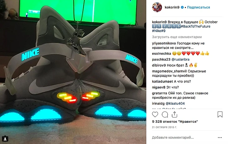 Сам Кокорин облачен в шорты из той же коллекции за 65 тысяч рублей (995 долларов). Главное сокровище Александра – его ноги – заботливо стягивают автоматические ремешки футуристических кроссовок Марти МакФлая из фильма «Назад в будущее – 3». Выпущенные ограниченным тиражом в 89 экземпляров компанией Nike. Вся партия была распродана знаменитостям за один день по цене 2,1 млн рублей (32 тысячи долларов) за пару. Сколько они стоят сейчас, даже сложно себе представить.