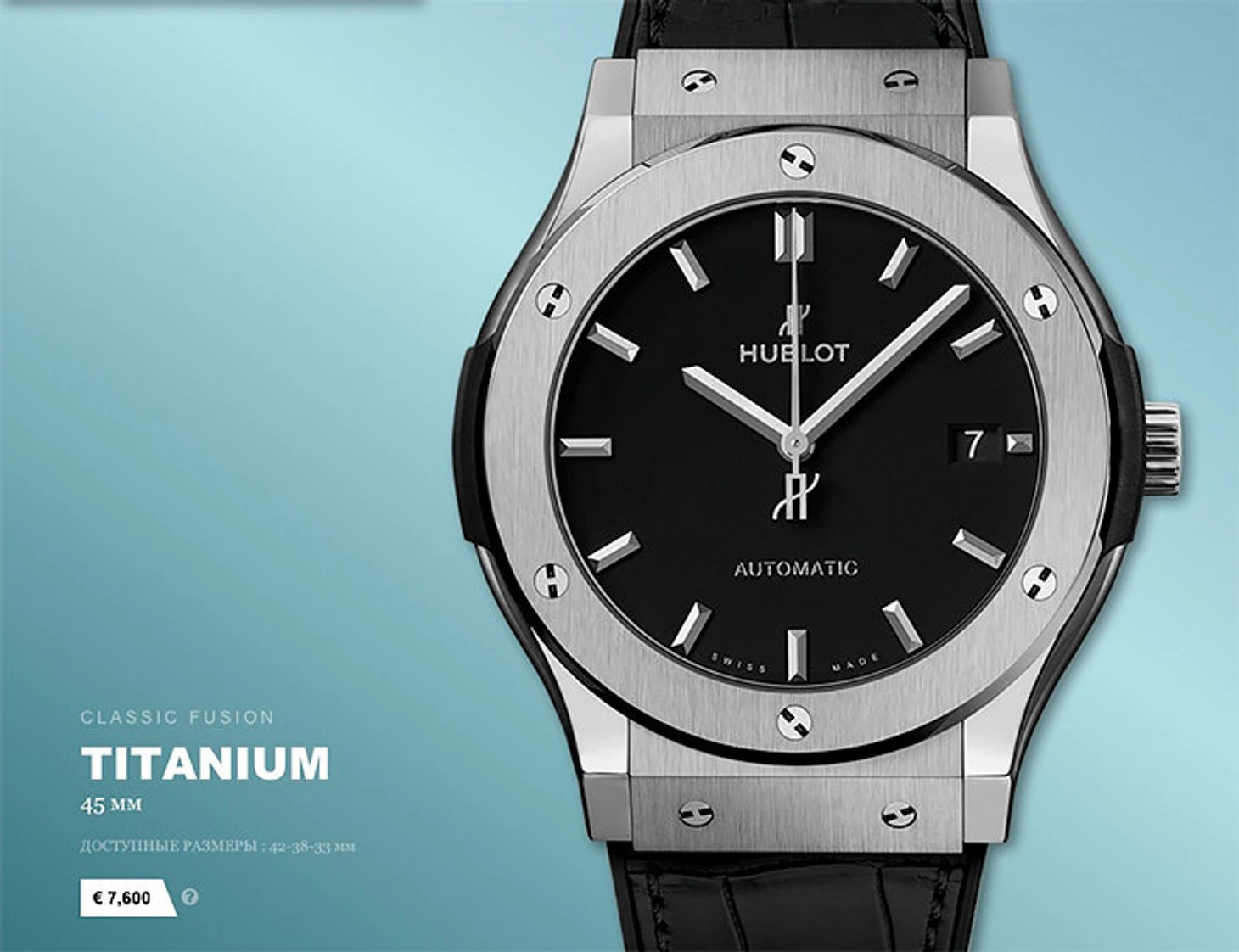 Часы называются Hublot Classic Fusion Titanium. Стоимость с официального сайта производителя – 7600 евро, что по текущему курсу – около 570 тысяч рублей.