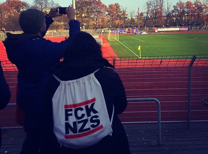 В отечественной фанатской среде с неформальными движениями принято связывать в первую очередь гамбургский «Санкт-Паули», но, поверьте мне, «фиолетовые» могут дать прикурить «пиратам» без лишних вопросов. Никакого дресс-кода и модных шмоток – только то, что люди носят в обычной жизни. А ведь есть в этом что-то душевное, не правда ли? Вот и зайдя на стадион я тут же столкнулся с девушкой, которая облачилась в рюкзак с надписью FCK NZS (Fuck Nazis). Да, нацистов тут явно не жалуют.