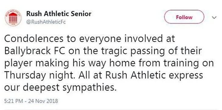 ОдВ юношеской лиге провинции Ленстер, что в Ирландии, случилось шокирующее событие. Футбольный клуб "Боллибрэк" сообщил, что один из их футболистов умер на прошлой неделе. В субботу дублинской команде предстояло играть против "Эрклоу Таун", но матч отложили после того, как пришла эта страшная весть.