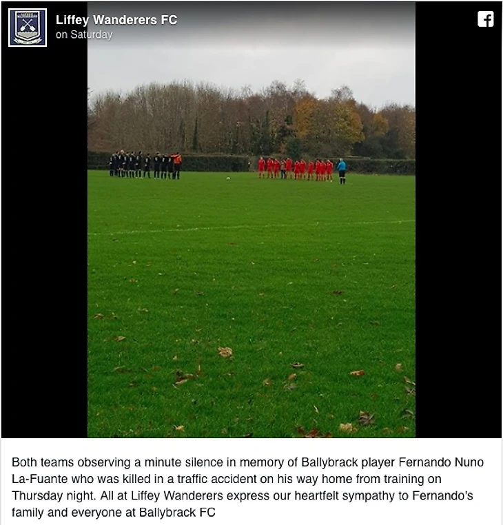 На фото ниже - "Лиффи Уондерерс" как раз рассказывают о траурной предматчевой церемонии на своей игре, а заодно выражают соболезнования родственникам и клубу "Боллибрэк".