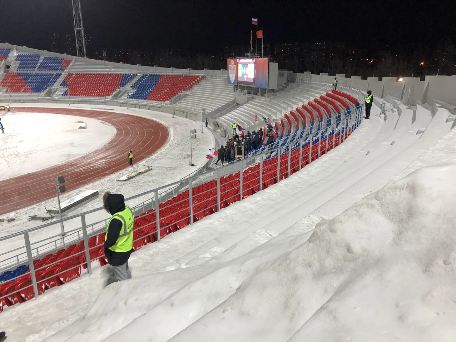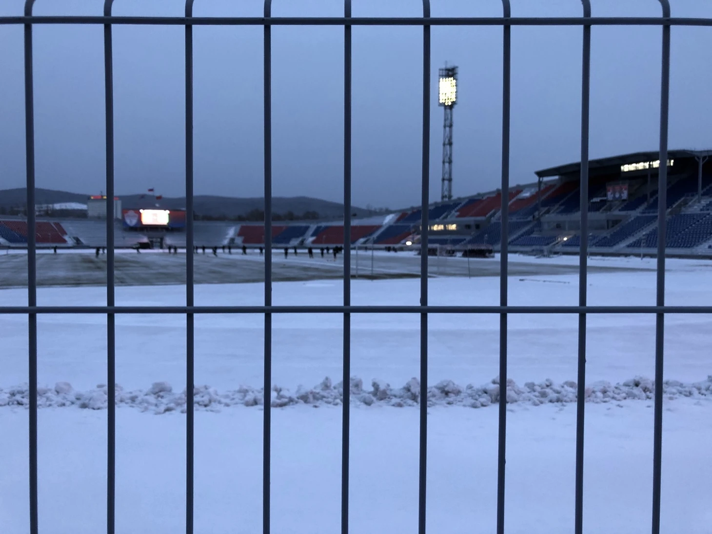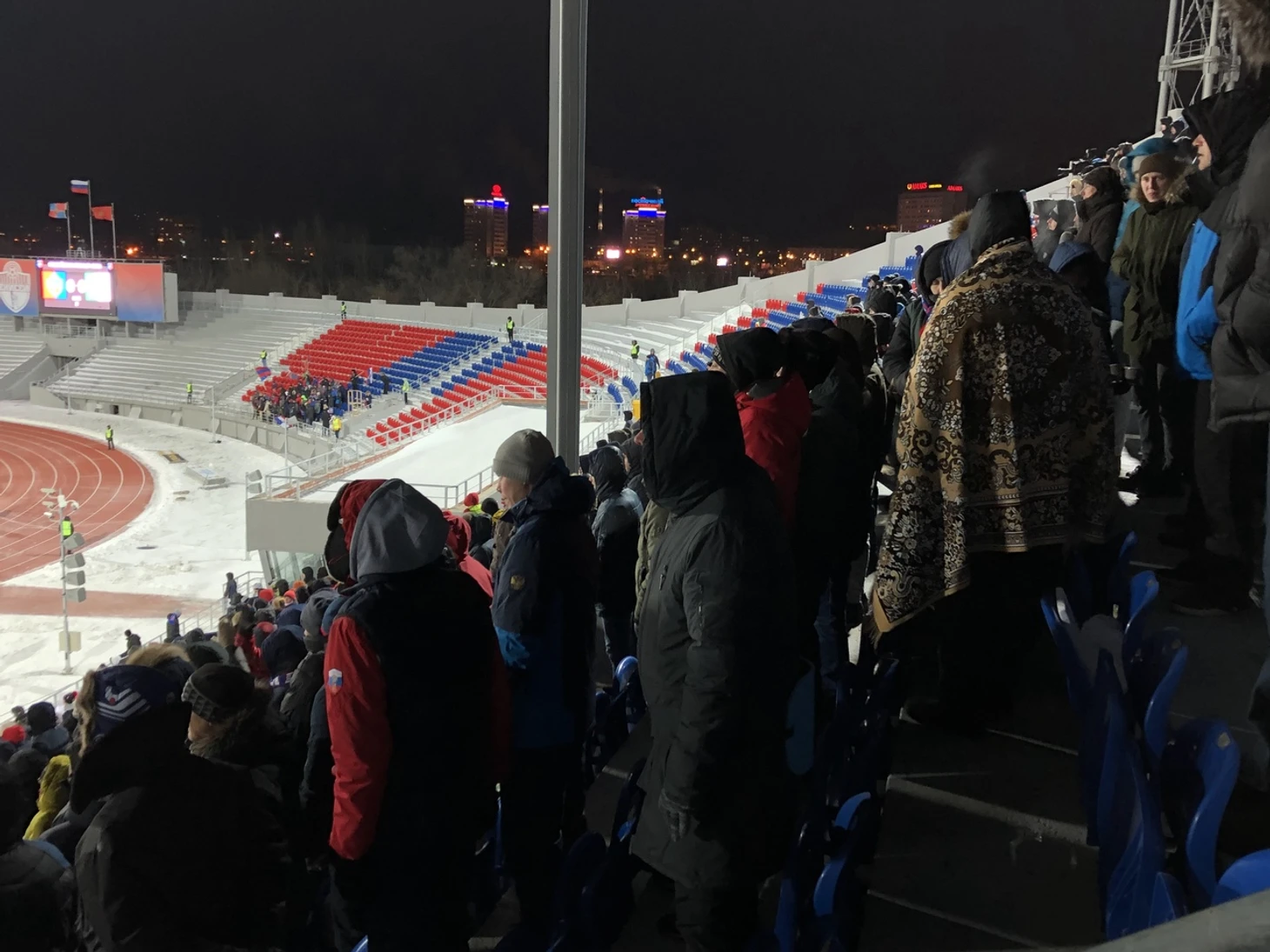 Пока добираюсь до мест со столами для ноутбуков, прохожу мимо фанатов. Их на матче собралось тысячи две. И дело даже не в бесплатных билетах. Просто для местных такая погода – норма жизни. Если бы не футбол, они пошли бы, скажем, на хоккей с мячом. И это сейчас для их построили крытый манеж – к пресловутой Универсиаде, а до этого – так и сидели в минус 20, грелись алкоголем и болели за «Енисей».