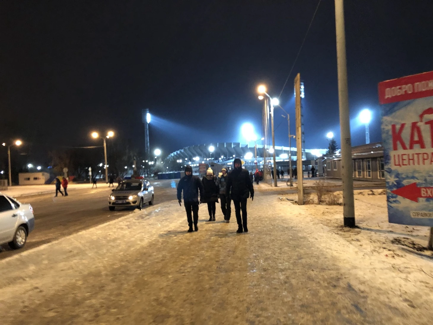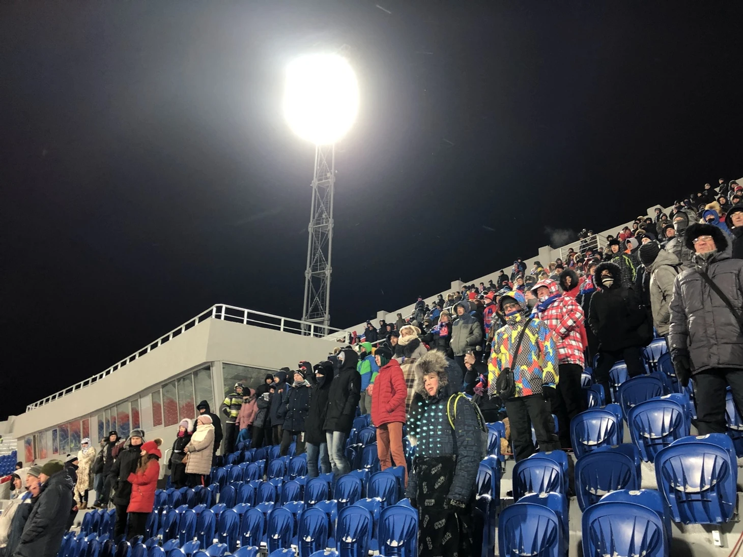 Приехали как раз к перерыву – навстречу со стадиона бегут люди. Вот бабушка с укутанным в два пуховика, стянутых розой «Енисея» внуком – спешат домой. Вот два парня несутся – к магазину с алкоголем, который находится через Енисей, не на острове. До него километра полтора – спешат, чтобы успеть на второй тайм. Мимо нас прошли человек сто. По ощущениям – половина – домой, а половина – за согревающим средством.