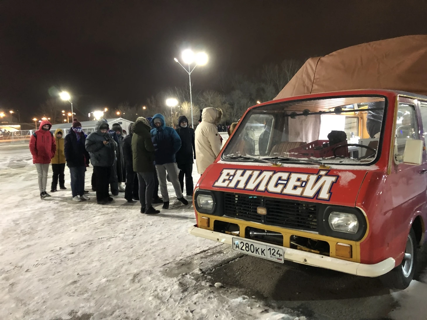 Но нам надо спешить. Вываливаемся обратно на мороз и бежим мимо задрипанного советского «мультивэна», раскрашенного в цвета «Енисея», одного из тех, что мы в детстве называли «Рафиками».