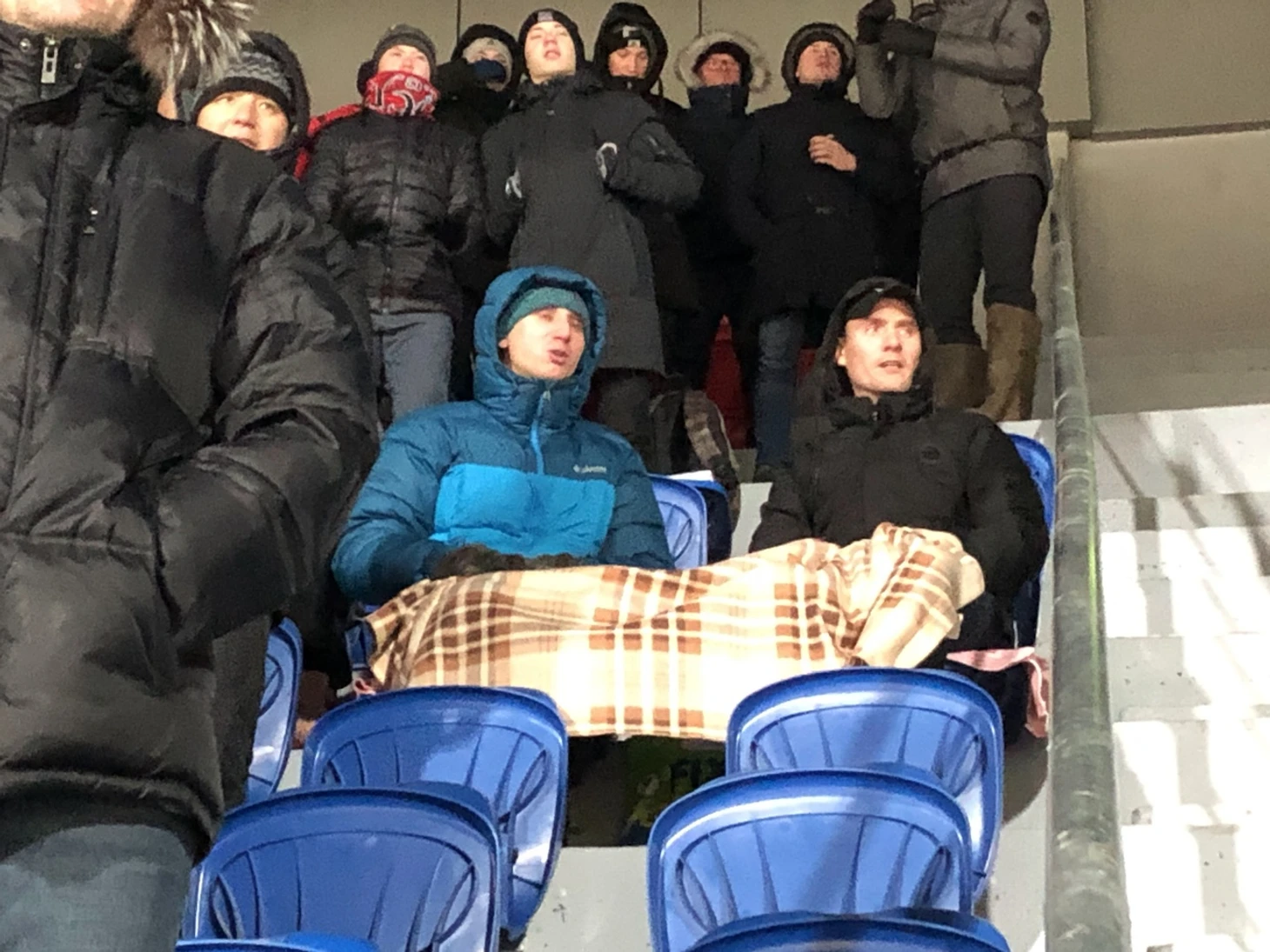 Вот люди кутаются в ковер – «Ростов» отдыхает. Вот парни сидят под одним одеялом. Вот кто-то отхлебывает из бутылки – вряд ли станешь пить на таком холоде спрайт. Скорее всего внутри что-то крепкое, что на проходной пропустили то ли случайно, то ли специально, понимая, что по-другому футбол смотреть невозможно.