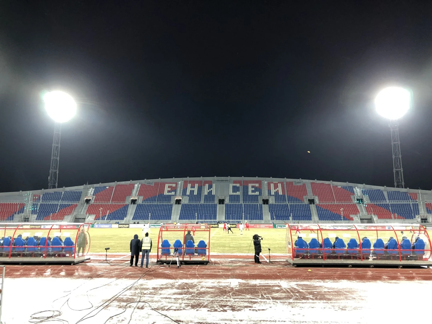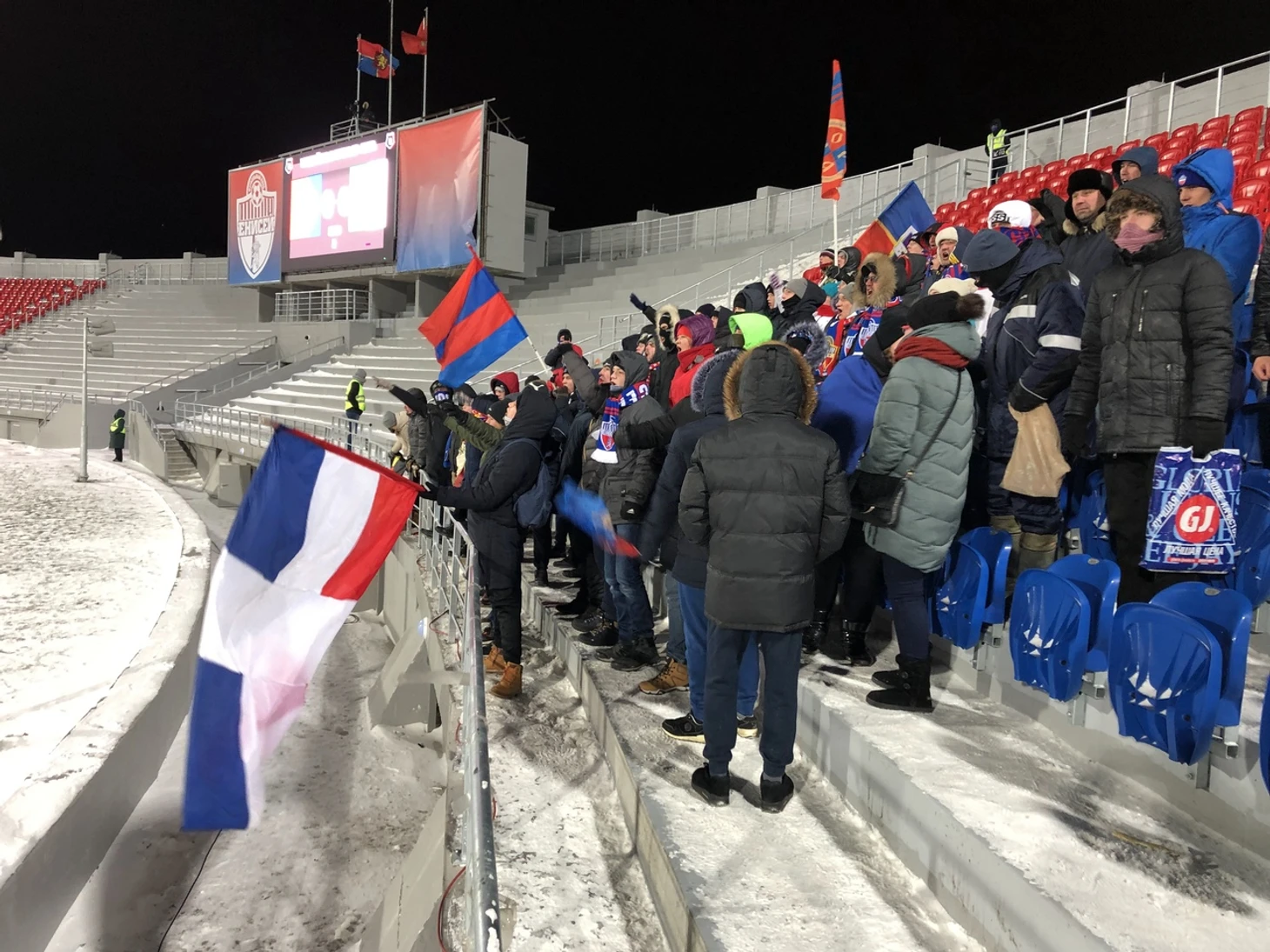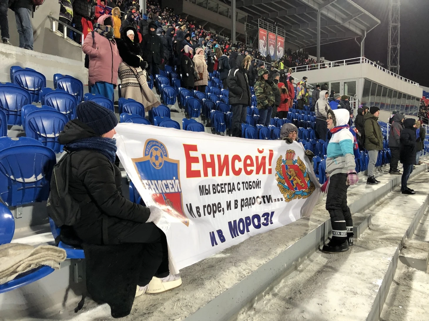 Есть баннеры и на центральной трибуне. один из них специально приготовили к этой встрече: «Енисей! Мы всегда с тобой! И в горе, и в радости… И в мороз!» Вот это любовь!