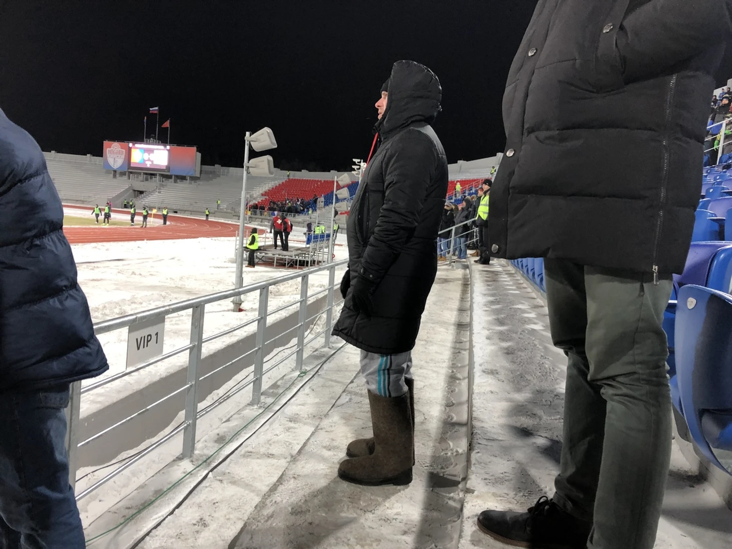 Я рвусь в ложу прессы. Проход в нее – через VIP-сектор. Первое, что вижу – мужик в валенках в випе – самая правильная обувь в такую ночь.
