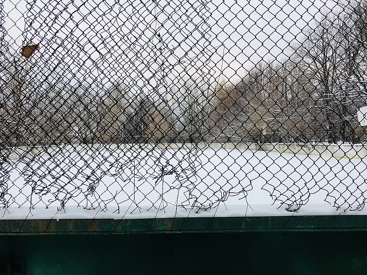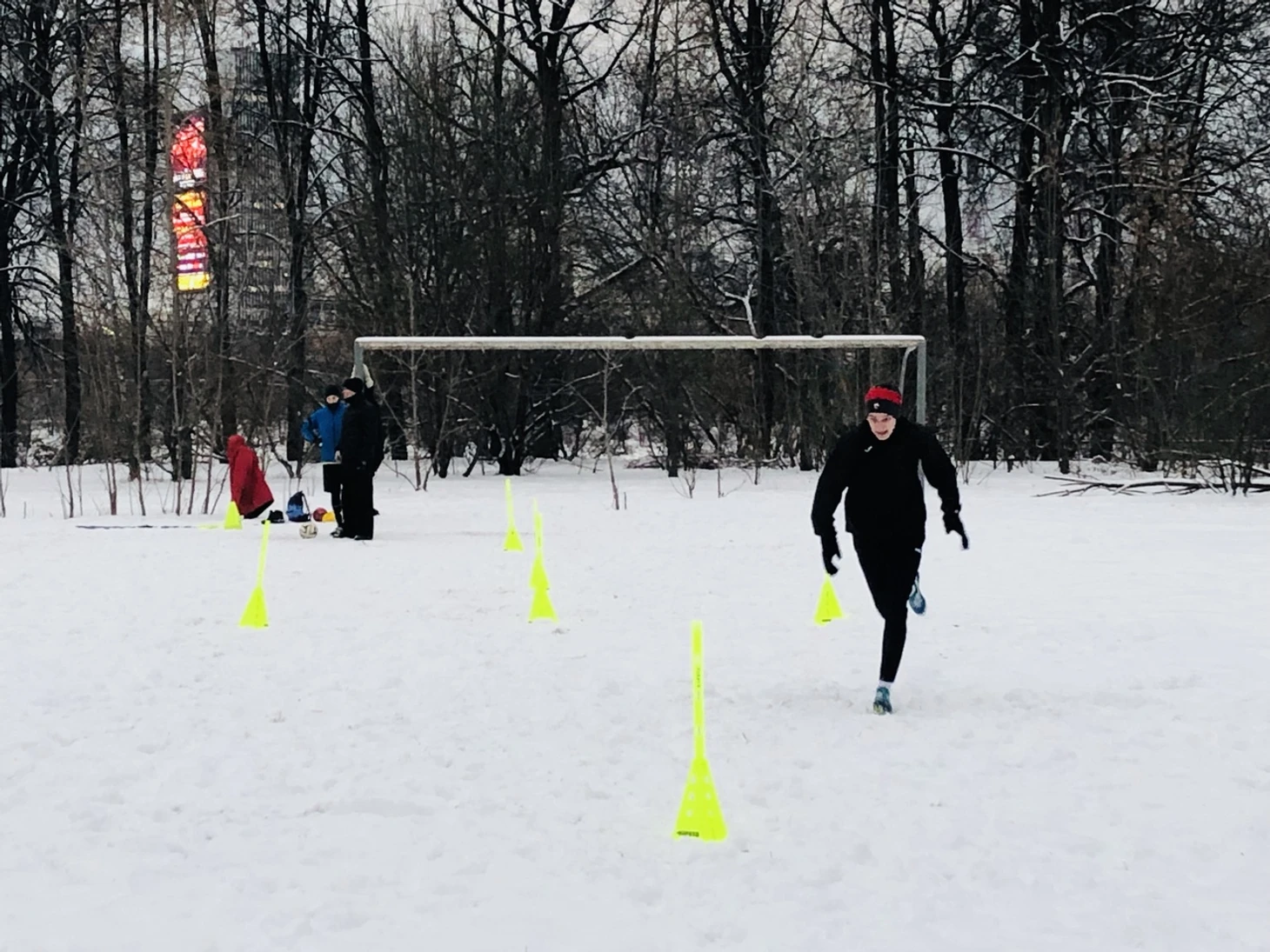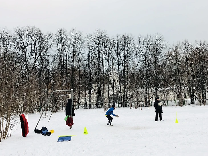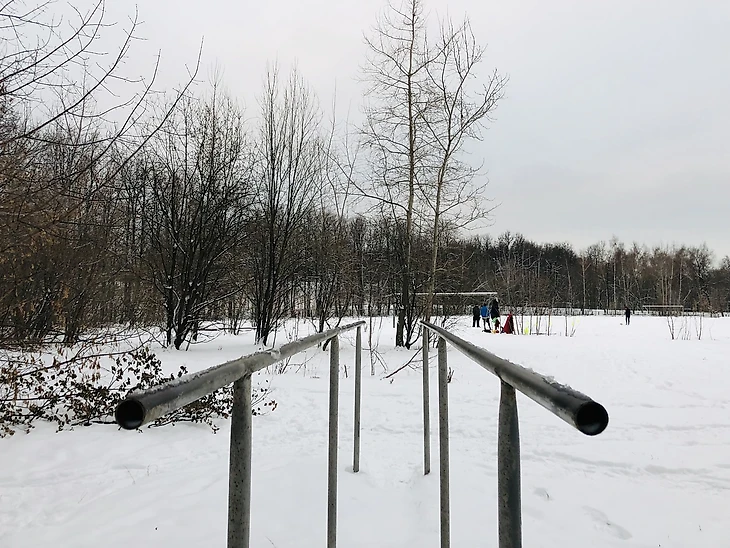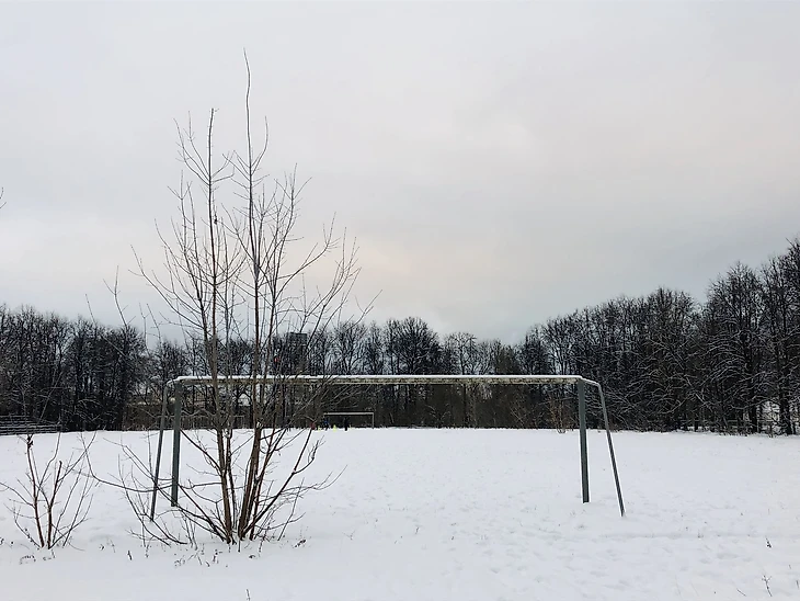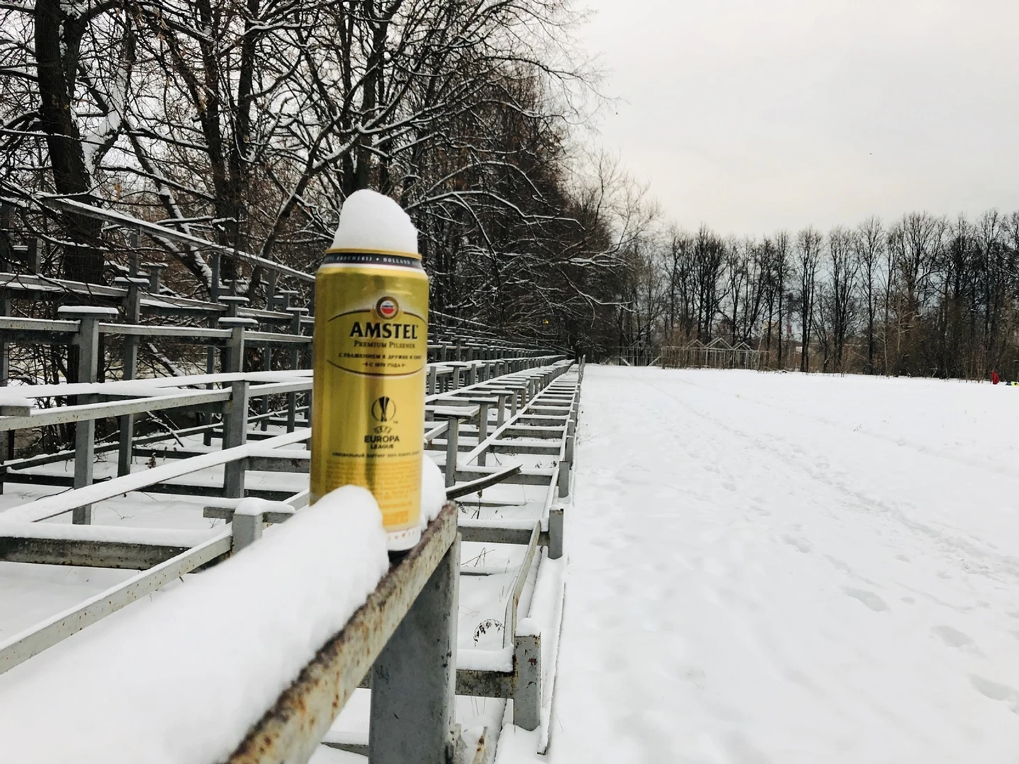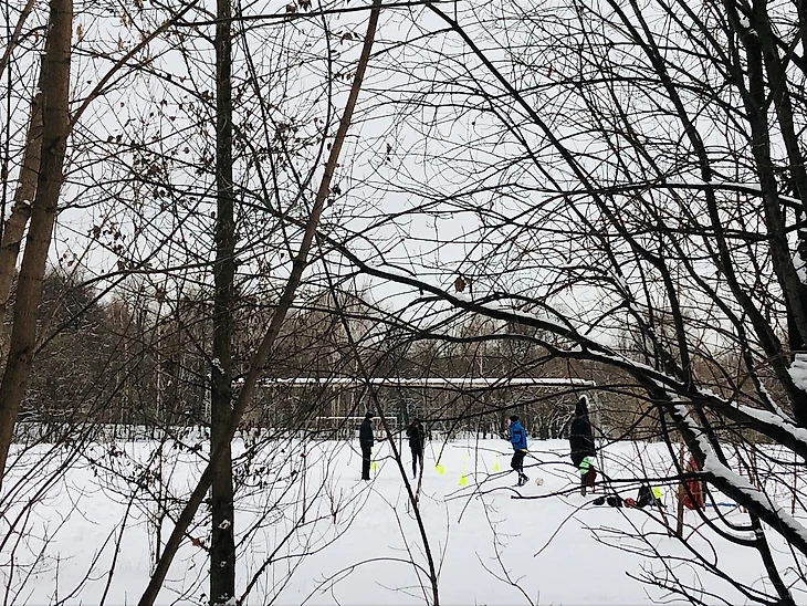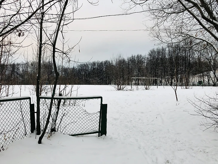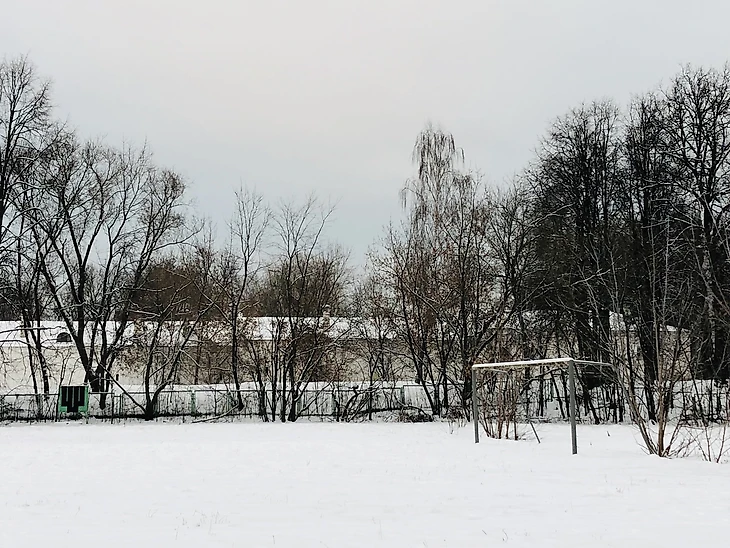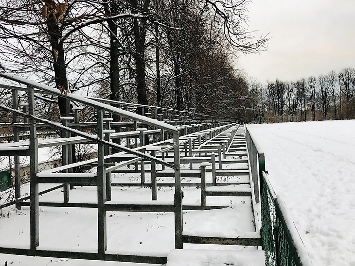 Если честно, мы сильно припозднились, посетив стадион МЭЛЗ в начале декабря. Из-за снега газона не видно. Правда, даже в такую погоду здесь занимаются футболом – на дальних воротах работают два молодых футболиста с тренером.