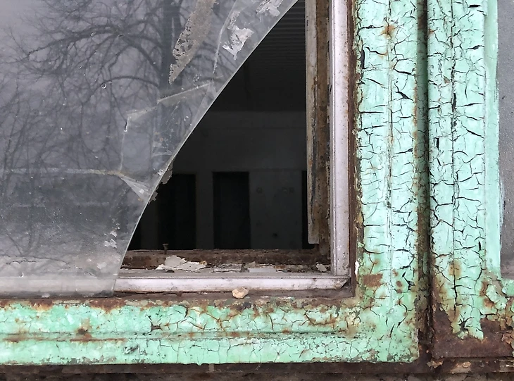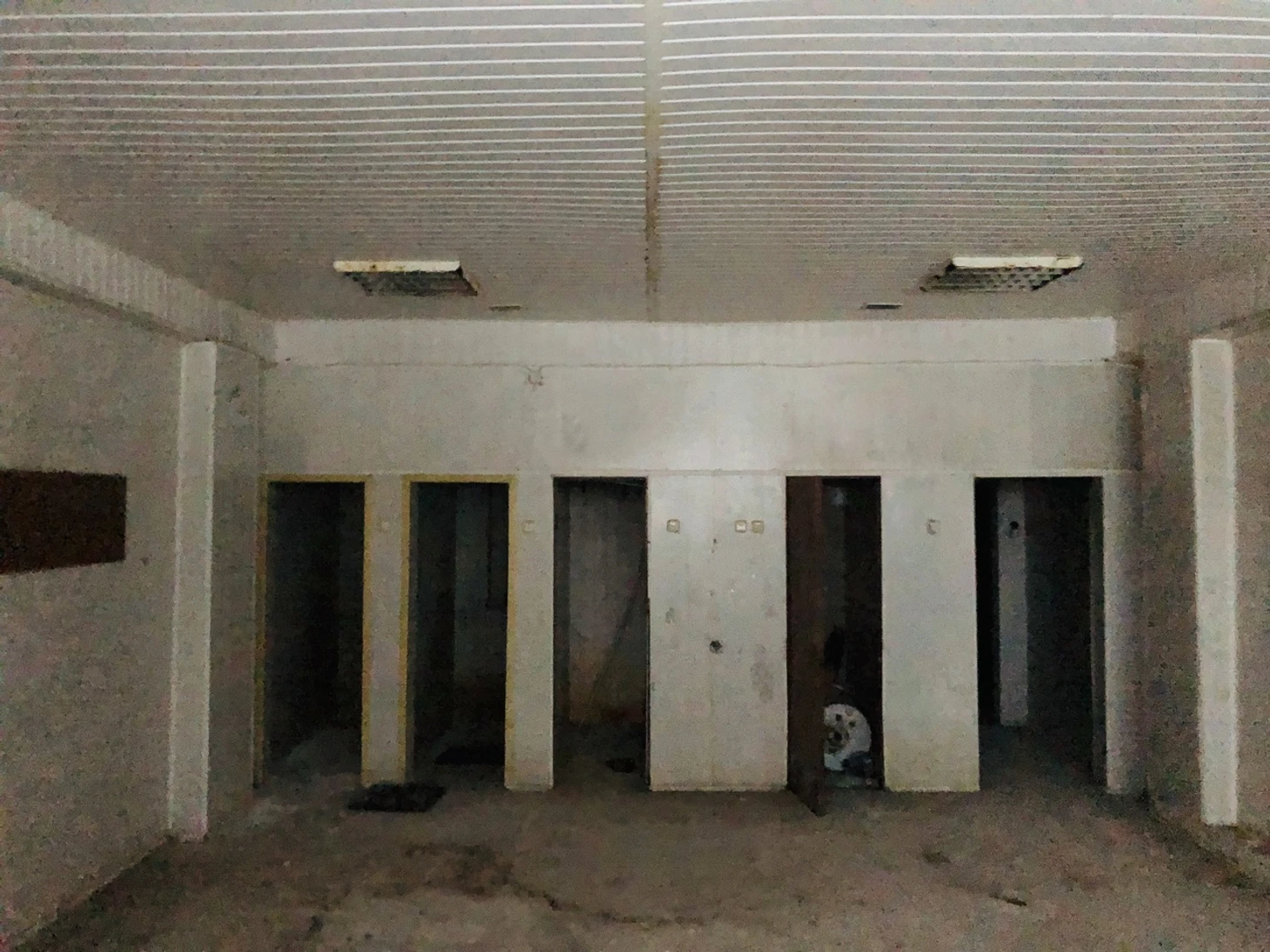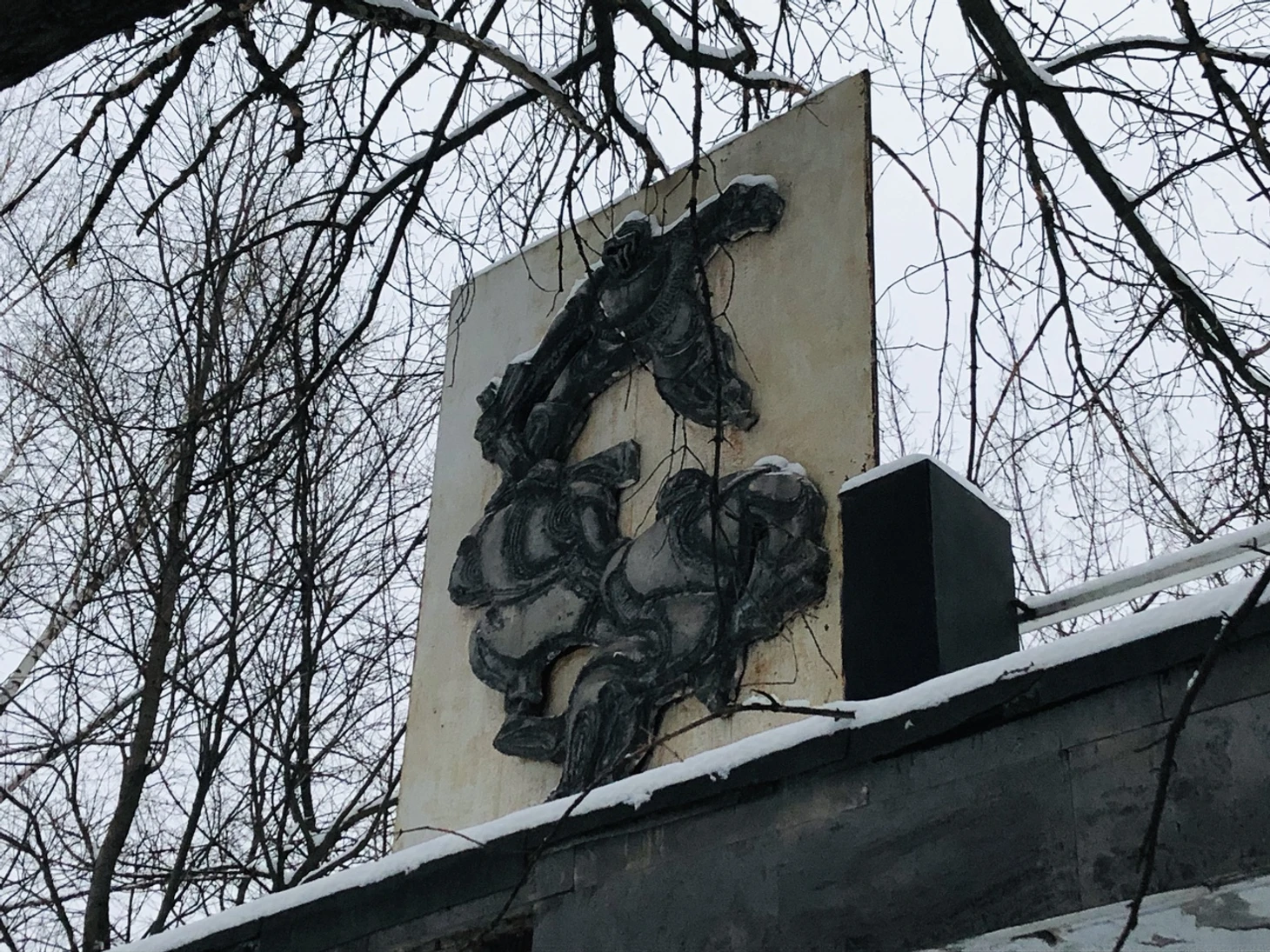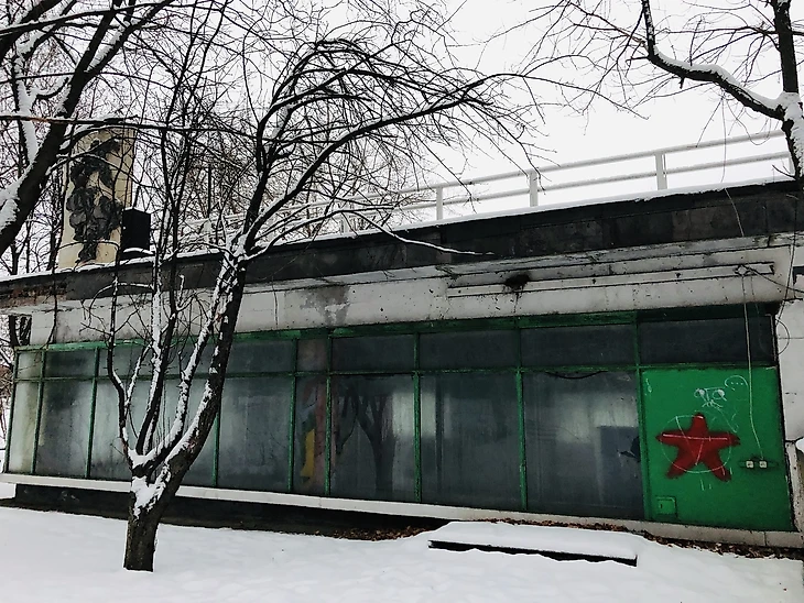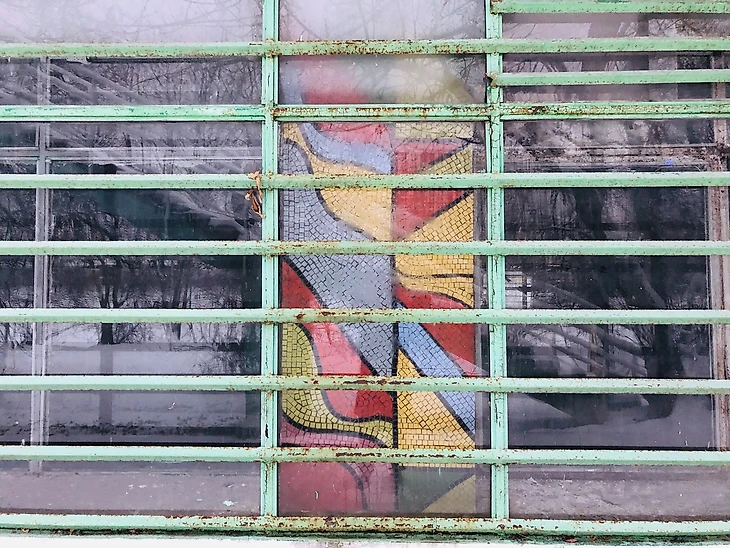 Доходим до здания с раздевалками. Оно закрыто на замок. Внутри – никаких признаков жизни. Через стекла видно красивую, но уже осыпающуюся мозаику. Все говорит о том, что никакого сторожа здесь уже давно нет. За грязным стеклом видим табличку с объявлением о продаже и телефонным номером.