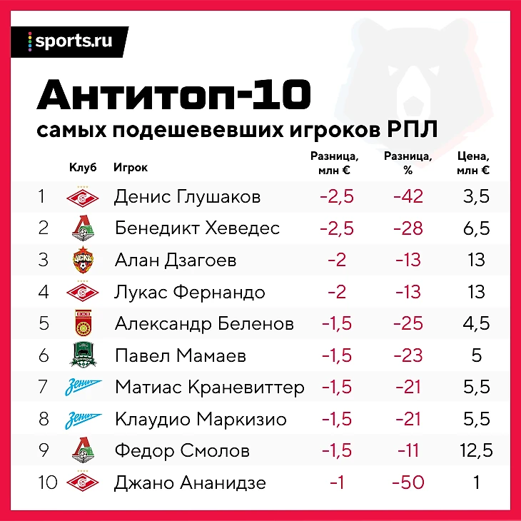 Вывод 3: Самые подешевевшие футболисты, как в абсолютных числах, так и в относительном соотношении – игроки «Спартака». Денис Глушаков потерял больше всех – 2,5 млн евро; да, как и у Хеведеса, но в соотношении с предыдущей стоимостью немец потерял куда меньше капитана «Спартака». Больше всего в процентном соотношении потеряли Джано Ананидзе и Андрей Ещенко – минус 50% от прошлого ценника у каждого.