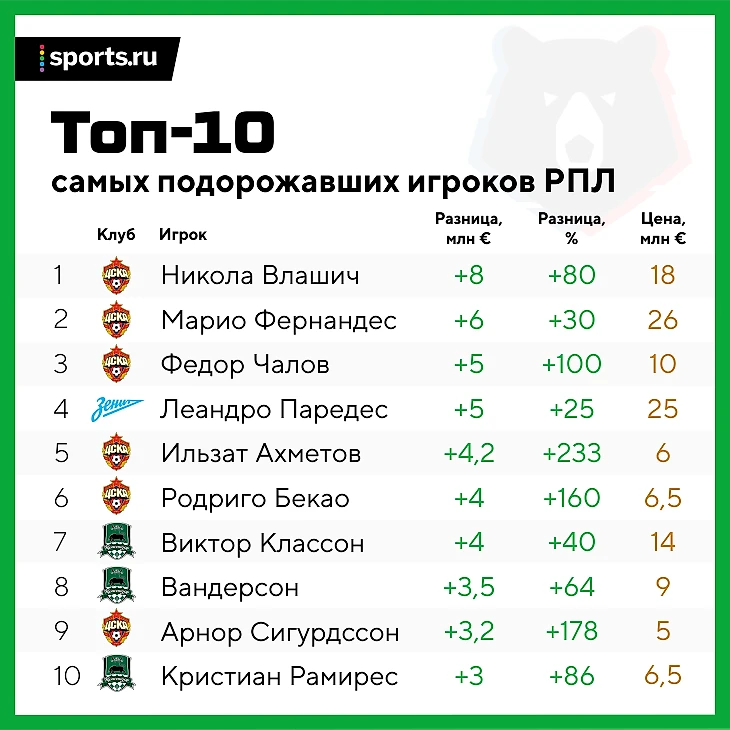 Вывод 4: Три самых подорожавших игрока РПЛ играют за ЦСКА. Никола Влашич прибавил в цене 8 млн евро, Марио Фернандес – 6 млн евро, а Федор Чалов – 5 млн евро. Лендро Паредес из «Зенита» тоже подорожал на 5 млн евро, но для него это лишь прибавка в +25%, а для Чалова сразу +100%. В относительных числах первенство тоже за игроком ЦСКА: на 300% выросла стоимость Лассаны Н’Диайе – с 50 до 200 тысяч евро. Аналогичную прыть показал молодой нападающий «Рубина» Артур Сагитов.