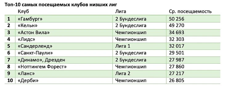 В следующем рейтинге тот же «Спартак» с нынешними показателями располагался бы в середине таблицы – речь о десятке самых посещаемых клубов из низших лиг. И снова в него вошли исключительно европейские клубы: 5 английских, 4 немецких и даже один французский.