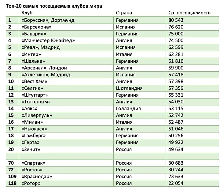 Ниже – список двадцати самых посещаемых футбольных клубов планеты по состоянию на 14 января 2019 года плюс еще четыре самых посещаемых российских клуба – для сравнения.. Вряд ли надо что-то объяснять. Мы просто выделим несколько интересных моментов.