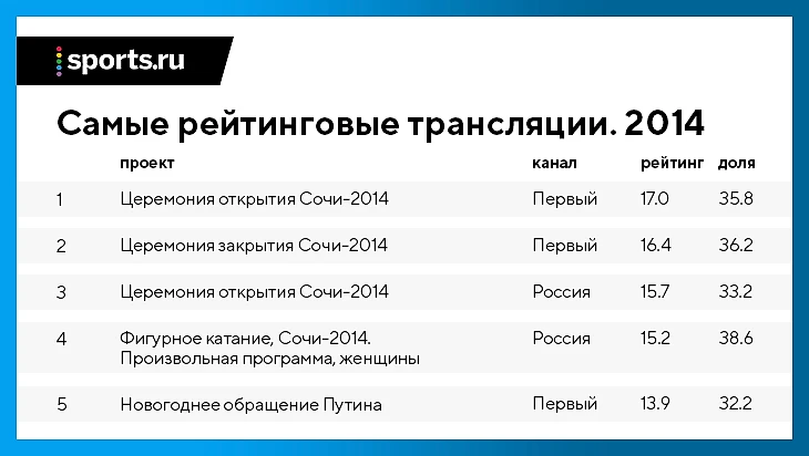 Россия красиво провела Олимпиаду в Сочи, потом случился Крым, вирус Эбола поджарил планету, а Ice Bucket Challenge ее охладил. Сборная провалилась на ЧМ в Бразилии, и в телевизионном топе футбол уступил место фигурному катанию.