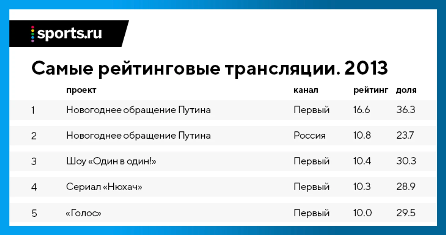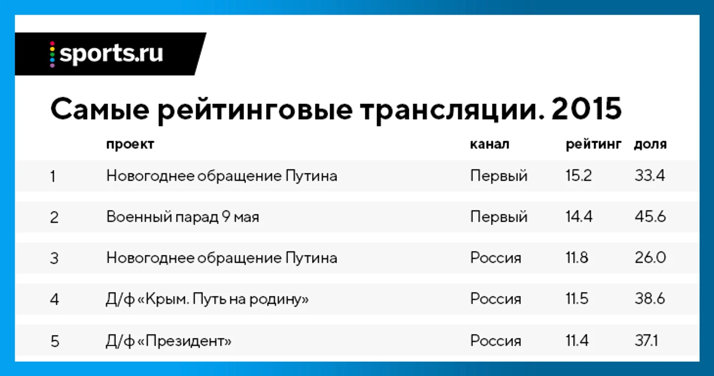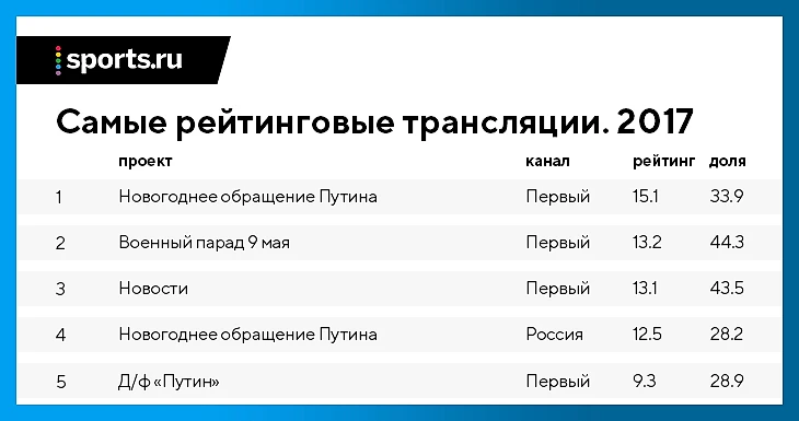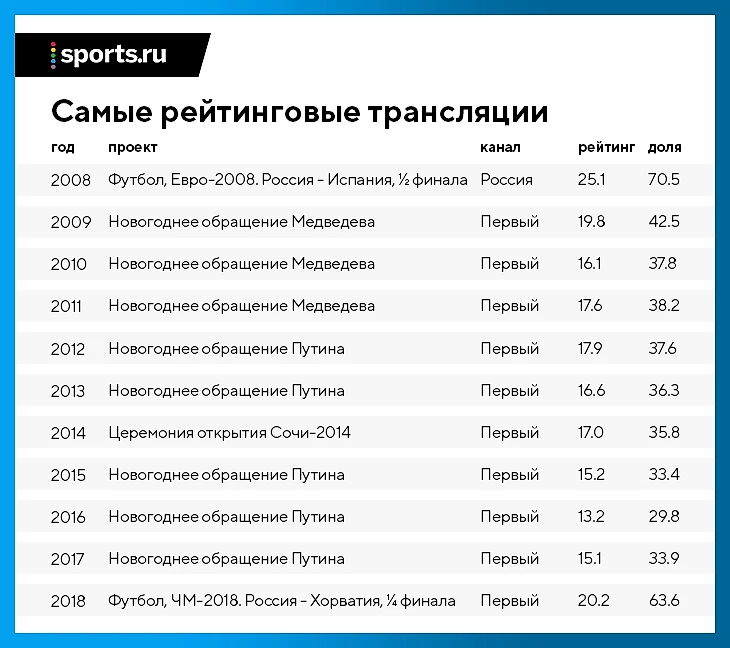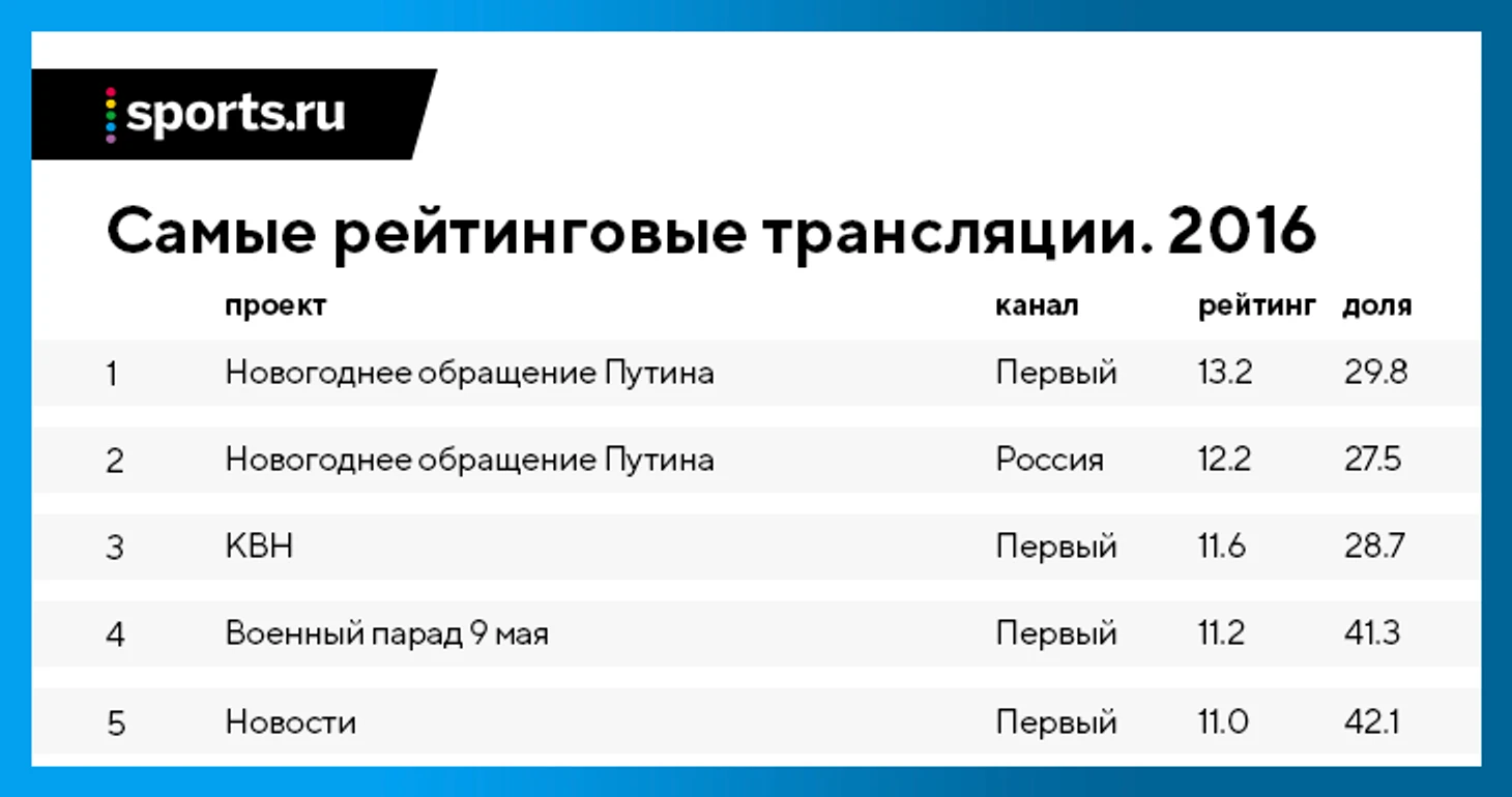 В итоге волна обожания подбросила сборную Россию на первое место сводного рейтинга по всей стране – где стоят и политические ток-шоу, и трансляция парада, и новогоднее обращение Владимира Путина. Футбол не обгонял президента со времен Евро-2008. Рейтинг от компании Mediascope, которая изучает популярность телевизионных программ.