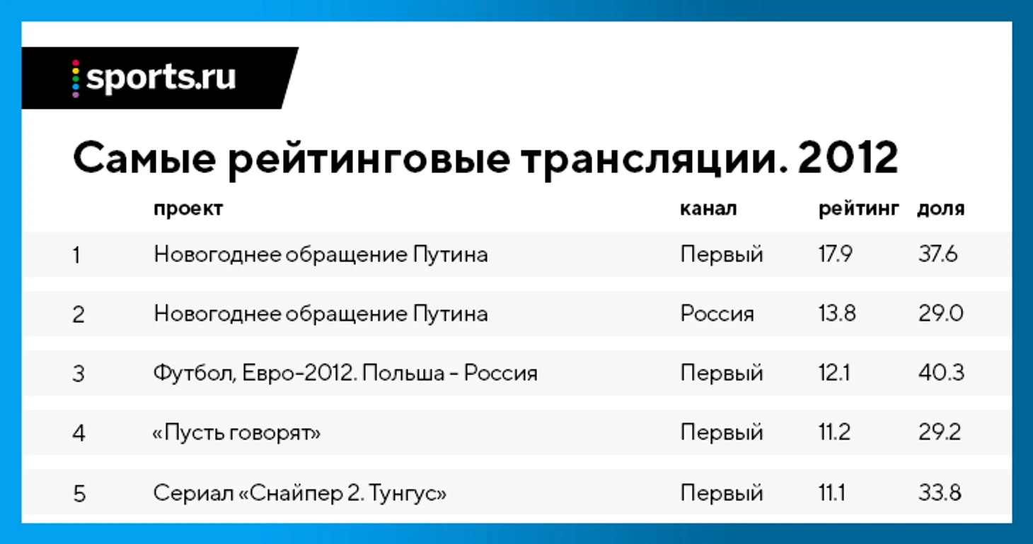 Сборная по телерейтингам обогнала новогоднее обращение Путина. Такого не было с 2008-го