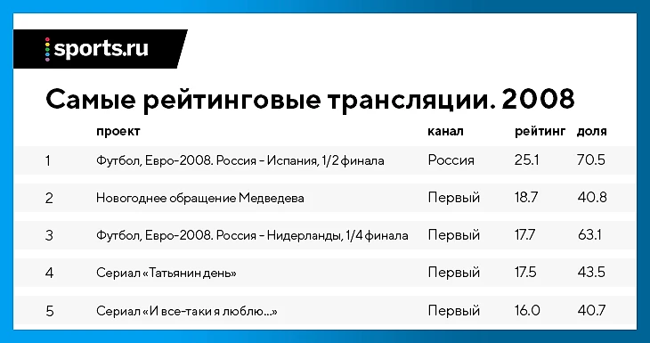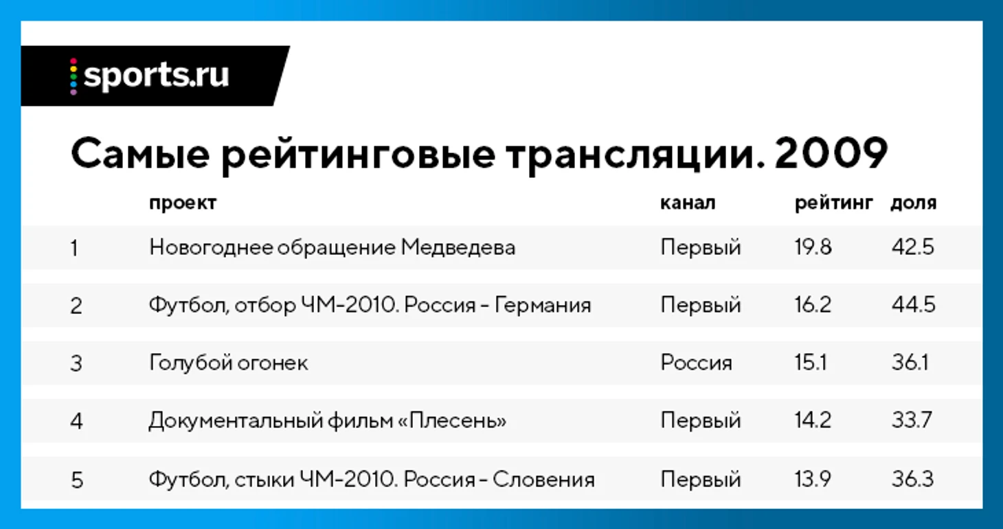Лидеров сборной позвали в Англию, умер Майкл Джексон, человечество увидело «Аватар». И – боль от стыков со Словенией. Марибор, гол Дедича и потерянный шанс увидеть Россию в ЮАР. С того года футбол на ТВ смотрели все меньше – пропорционально интересу к сборной, а новогоднее поздравление президента захватило первое место. Обратите внимание на рейтинг трансляций в целом, падение ощутимое.