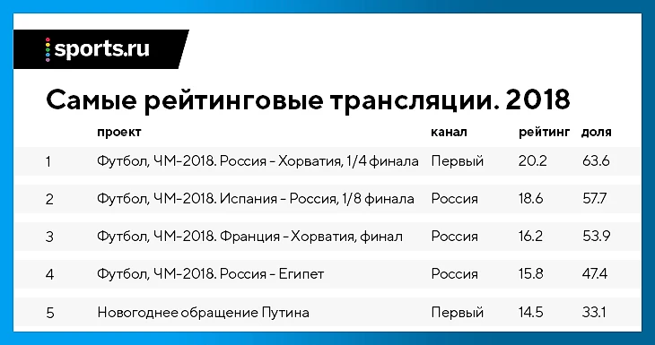 В 2018-м спорт собирал очень высокие телевизионные рейтинги. Логично: месяц чемпионата мира по футболу, Хабиб бился с Конором, хоккеисты взяли олимпийское золото.