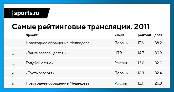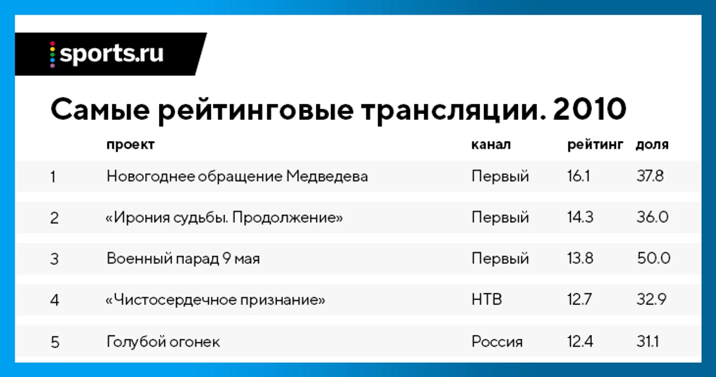 Слишком много трагедий. Взрывы в московском метро, гибель польского президента под Смоленском, резня в станице Кущевская. А еще провал России в Ванкувере, Манежка и отставка Лужкова. Ни одна спортивная трансляция не выбилась в топ-5. Олимпиада – раз, ЧМ в ЮАР без России – два.