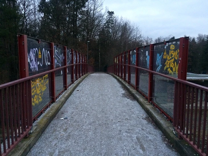 Пока я добирался по холмам на уютном трамвайчике до стадиона, то встретил сразу несколько человек в атрибутике дрезденского «Динамо». Тут «шварц-гельб» любят. Еще и потому, что местный клуб VFC Plauen носит такие же цвета. Но обо все по порядку. Трамвай сделал последний рывок на гору и высадил меня возле аллеи, уходящей в лес. Никакого намека на стадион нет абсолютно, кроме названия остановки – “Am Vogtlandstadion”. Значит, он где-то рядом. Переход через железнодорожные пути обклеен стикерами, а на аллее встречаются немцы, занимающиеся пробежкой. Еще бы! В такую-то погоду!