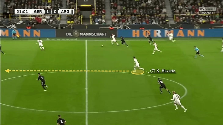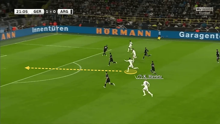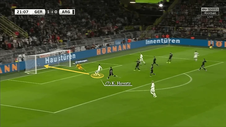 Многие из 46 голов, которые Хавертц забил за свои 4 сезона в Леверкузене, стилистически похожи на его первый мяч, забитый за сборную. Дело было в октябре 2019-го, когда Германия сыграла вничью с Аргентиной (2-2): резкий спринт, который начинается от середины поля, проход в штрафную, который идеально рассчитан по времени и позиции, и хирургически точный удар в завершающей фазе атаки.
