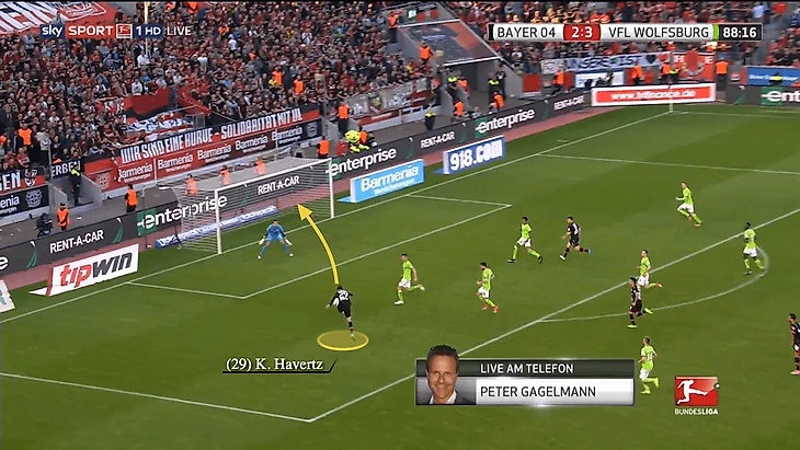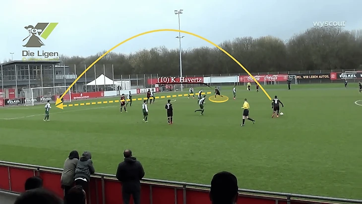 Второй ролик, который показали Хавертцу, был из марта 2016-го: его победный мяч в юношеской Бундеслиге в матче между «Байером» и «Фортуной» из Кельна. Здесь все очень сильно перекликается с голевым эпизодом в Порту, с одной лишь разницей – Кая забегал справа и из более глубокой позиции. Однако конец схожий – Хавертц врывается в штрафную, проскакивая между защитниками: «Я люблю совершать подобные забеги с правого фланга в центр поля.»