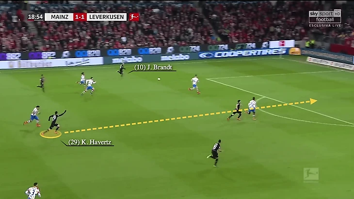 Главным поставщиком снарядов для Хавертца в «Байере» был Юлиан Брандт – его близкий друг в обычной жизни, с которым на поле они проводили потрясающие комбинации – именно об этом следующий эпизод. Хладнокровное замыкание передачи Брандта внешней стороной стопы в матче, где был разгромлен «Майнц» (5-1), февраль 2019-го. Здесь можно заметить, насколько рано Кай обращает внимание Брандта на себя, намекая на то, что в скором времени он окажется на ударной позиции. Это произойдет уже через три секунды.