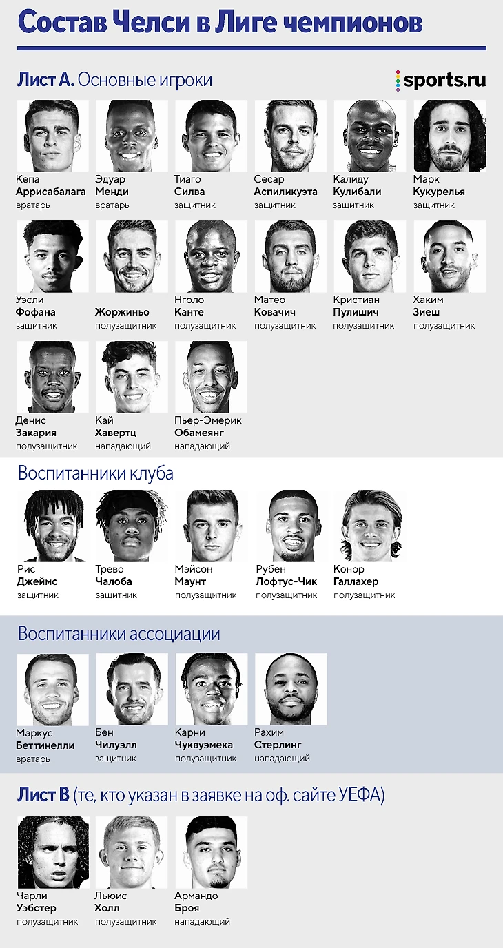 В списке А заявки Лиги чемпионов у «Челси», как и в АПЛ, 24 футболиста, правда немного в другом составе. Правила позволяют сделать лишь три изменения перед плей-офф. Условия по количеству игроков остаются. Дедлайн – 2 февраля.