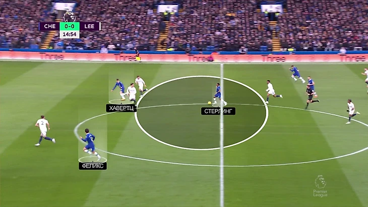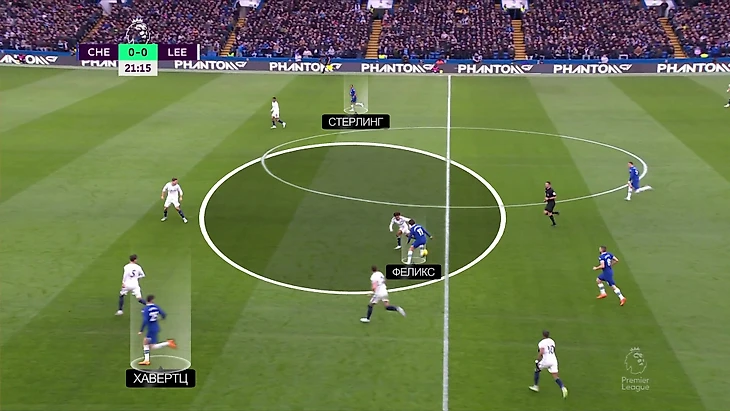 Четвертый аспект – переходные эпизоды и сочетаемость тройки атаки. «Челси» очень хорошо контратакует через центральную зону. Тройка атаки в рамках схемы 3-4-3 в каждом матче строилась по схожим принципам – связующее звено Феликс, скоростной игрок под открывания за спину (Стерлинг/Мудрик) и сочетающий в себе оба качества Хавертц. Это базовые склонности, но при этом все достаточно вариативны, чтобы чередовать функции.