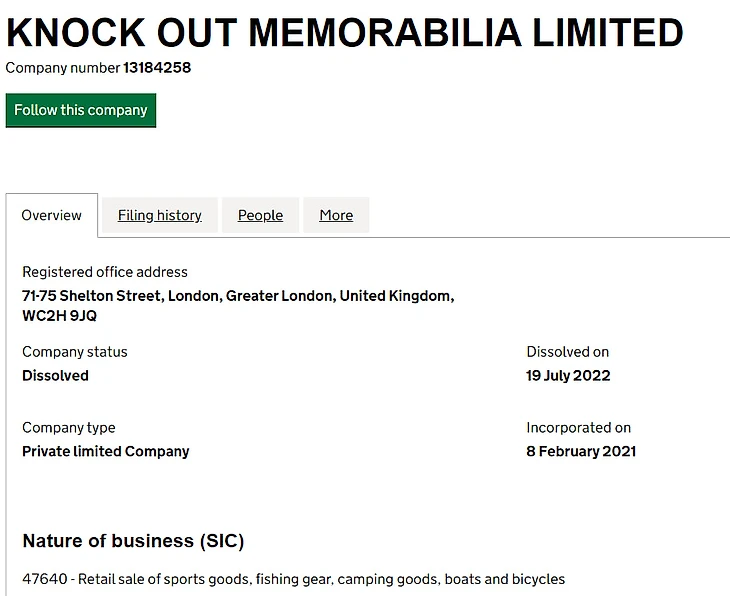 Детальный поиск компании Knock Out Memorabilia & Events приводит на официальный сайт правительства Великобритании, где указано, что компания с очень похожим названием Knock Out Memorabilia... ликвидирована в июле 2022-го.