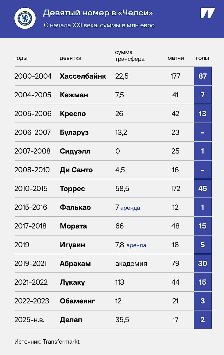 Делап уже 14-я девятка «Челси» с начала XXI века. Все провели в клубе 735 матчей и забили 224 мяча. Два лучших нападающих «Челси» за это время суммарно забили практически столько же – 223 гола (у Дидье Дрогба 164 мяча за 381 игру, у Диего Косты 59 голов в 120 встречах).