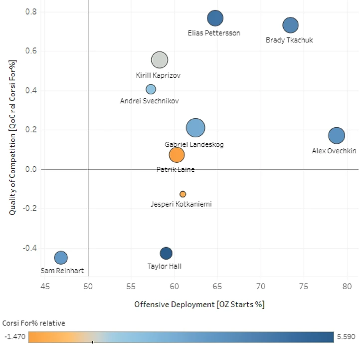 Ось Y - Corsi Rel QoC (Чем выше игрок находится на диаграмме, тем сильнее соперники, которым он противостоит).