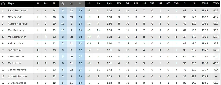 Самыми результативными игроками за этот период времени стали Павел Бучневич (7+12 в 14 играх) и Назем Кадри (6+13 в 10). Буч после не лучшего начала разыгрался вместе с русской тройкой в «Сент-Луисе», заставляя с горечью вспоминать всех болельщиков «Рейнджерс» свой обмен. Кадри показывает потрясающую результативность – 1,9 очка за игру. На очко от них отстает целая группа игроков, где следует выделить Мэттьюса, идущего на уровне средней результативности Кадри, забросив 13 шайб в 10 играх, включившись в полноценную борьбу за лучшего снайпера лиги. И с удовольствием для болельщиков отмечаем, что Кирилл Капризов продолжает радовать результативной игрой (7+11 в 12 играх), а также в ТОП-10 входит Александр Овечкин, идущий вровень с МакДэвидом.