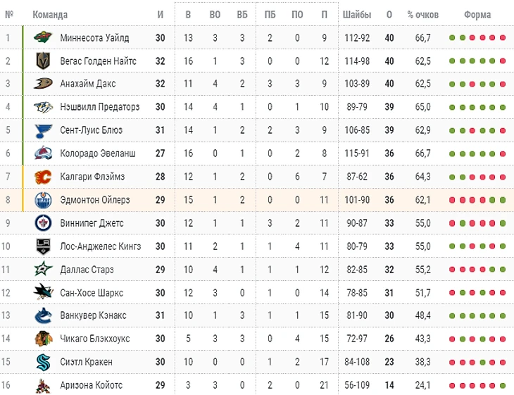 А вот на Западе все гораздо интереснее. За исключением «Аризоны», которая очевидно ставит задачу только победить в танковании, провалившегося на старте «Чикаго» и пессимистично начавшего свой дебют в лиге «Сиэттла», остальные команды имеют хорошие шансы побороться за выход в плей-офф. Первая восьмерка, которую замыкает «Эдмонтон» имеет преимущество, но весьма небольшое, учитывая еще более 50 игр до конца регулярки. Это очень легко отыгрывается удачной серией игр - например, приход Брюса «Всемогущего» Будро оживил плававших кверху брюхом «Касаток», выдавших после этого 6 побед подряд и теперь отстающих от зоны плей-офф всего на 6 очков. Настолько же горячие до перерыва были «хищники» из Нэшвилла, вплотную подтянувшиеся к лидерам конференции. Предсезонные фавориты от конференции «Колорадо» и «Вегас» раскатились и уверенно находятся в зоне плей-офф. Возглавляет Запад «Миннесота», которую перед началом сезона не списывали со счетов в борьбе за плей-офф, но мало кто был готов увидеть в лидерах с учетом штрафа за выкуп Паризе и Сутера (пока еще скромные 4,75 млн.), хотя 4 подряд поражения несколько притормозили поступь Капризова и Ко. Главным открытием сезона вообще стал «Анахайм», где нашли вторую молодость Гецлаф и Шаттенкирк, хорошо раскрылись молодые топ-проспекты (Тревор Зеграс и Джимми Дрисдейл), а и к тому же выстреливают ребята, от которых уже и не ждали чудес – Трой Терри, уже перебивший свой сезонный максимум в 1,5 раза, и Сонни Милано, который после списания в «Коламбусе» провел всего 15 игр в лиге. Симпатии российских болельщиков должны были привлечь «Блюзмены», где зажигает российская тройка Барбашев-Бучневич-Тарасенко.