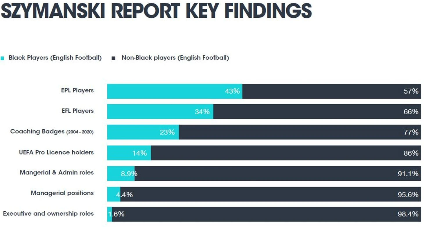 В английском футболе подавляющее число менеджеров — бывшие профессиональные игроки. Тем не менее темнокожих бывших игроков, как правило, игнорируют для работы на видных должностях. Из 94 человек, игравших в Премьер-лиге или Футбольной лиге с 2004 года и имеющих лицензию UEFA Pro (высшая профессиональная квалификация, доступная менеджерам – прим.) ¾ занимали руководящие должности в Топ-4 дивизионах Англии в 2021 году. Только 23% из них были темнокожими. По данным Партнерства темнокожих футболистов (BFP – прим.), организации, выступающей за лучшее представительство темнокожих людей на руководящих должностях в спорте, в истории английского профессионального футбола было всего 28 темнокожих менеджеров.