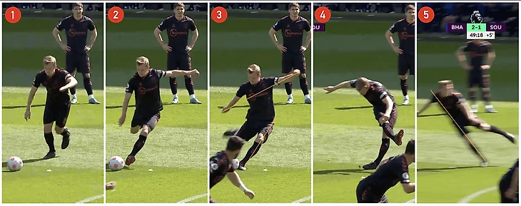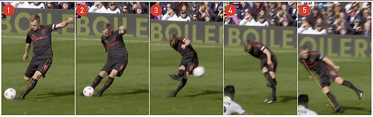 Смит подчеркивает, что это является последствием его техники, так как «он отрывается от поверхности поля после контакта, приземляется на бьющую ногу и к тому времени уже практически повернут на 90 градусов». Это можно увидеть на изображении 5.