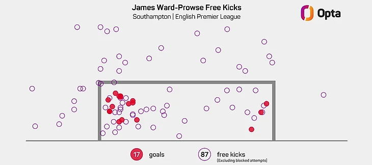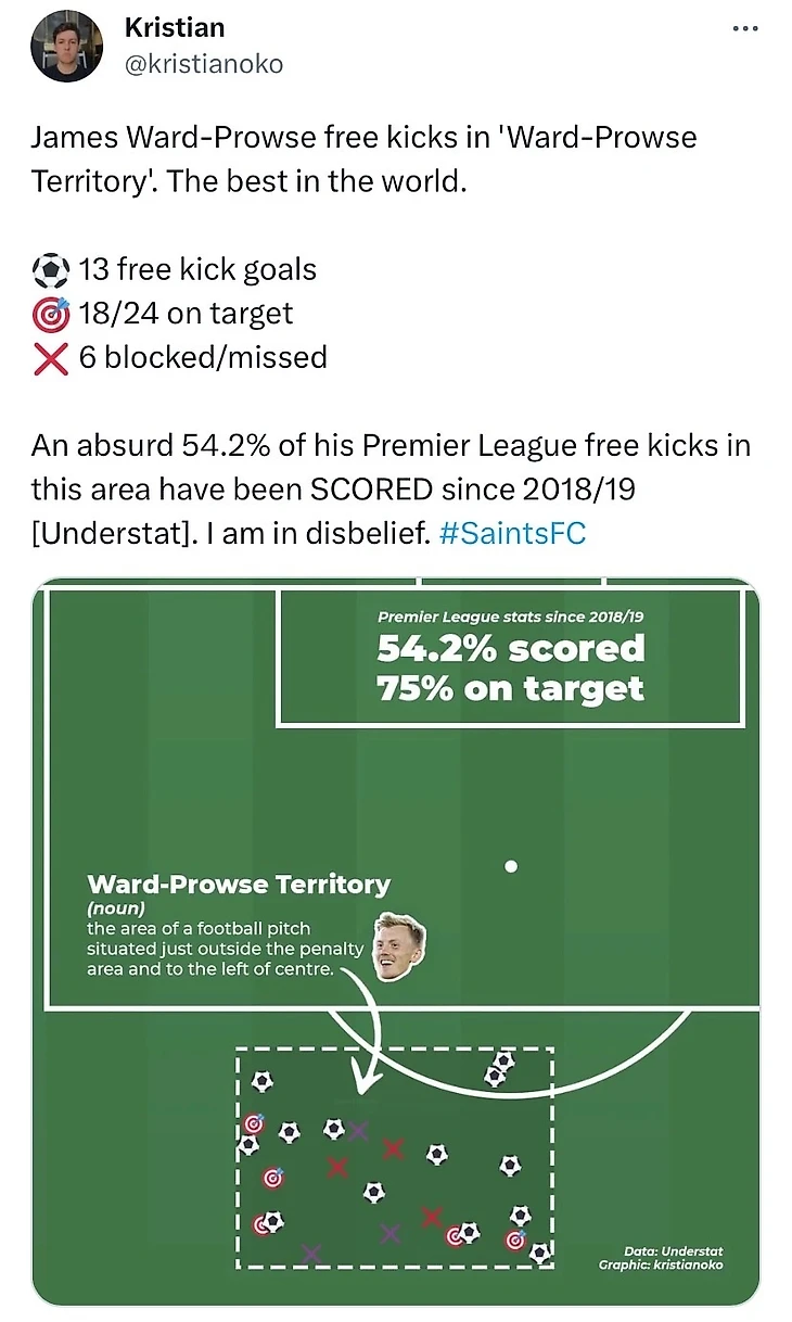 Мастерство Уорд-Проуза в выполнении штрафных ударов стремительно растет. 16 из его 17-ти таких мячей были забиты с начала сезона 2017-2018 гг., и 12 из них в Премьер-лиги после повышения «Саутгемптона» в июне 2020 г. Видео ниже показывает его первые 12 голов, включая гол против «Вулверхэмптона» в январе 2022 г. Тот факт, что он забил еще 5 голов менее чем за год, показывает, насколько он прогрессирует.