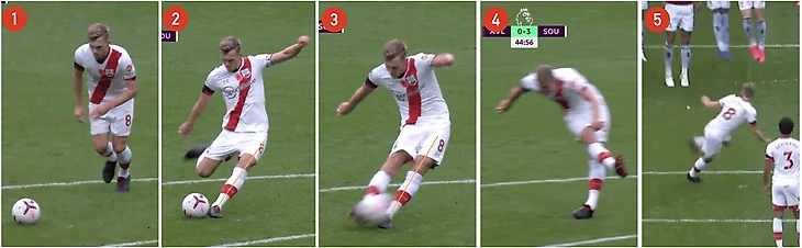 Мы может увидеть похожие вещи и во втором голе против «Астон Виллы» на выезде в октябре 2020 г. (победа 4:3). На тот момент главный тренер «Саутгемптона» Ральф Хазенхюттль сказал после игры, что его голы со штрафных «становятся лучше». В том матче он стал девятым игроком в истории АПЛ, забившим два прямых штрафных удара в одной игре.