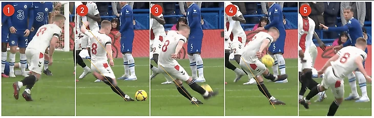 Мы говорим о миллисекундах, но нога Уорд-Проуза остается в контакте с мячом дольше, чем у большинства исполнителей. Стоит обратить внимание, что левая нога остается прямой в момент удара.