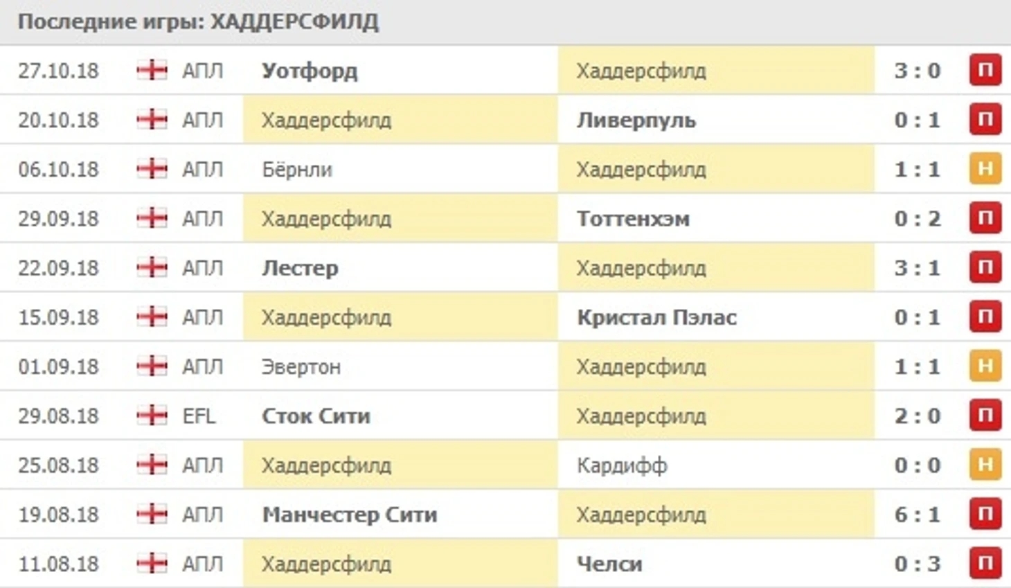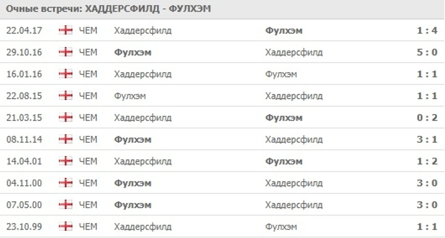 Тем не менее, соседи по таблице отличаются уровнями. В междусобойчиках с 1999 года «терьеры» ни разу не выигрывали у «Фулхэма» — 7 побед лондонского клуба, и три ничьи. И, что самое интересное — снова результативность «Хаддерсфилда» равна одному голу максимум! Тоесть, в очных встречах «терьеры» также не забивали больше одного мяча.