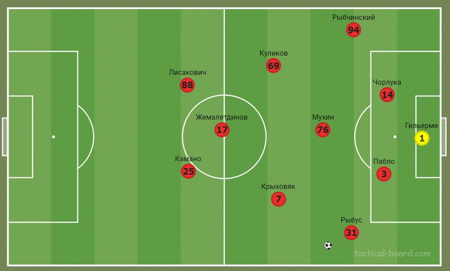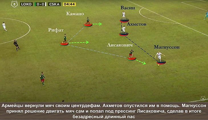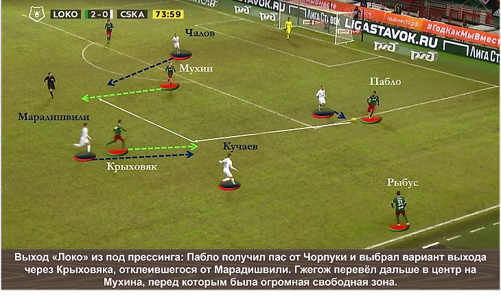 Армейцы предпочитали не мудрить с выходом из обороны, применяя средний и длинный пас: у Помазуна 61% передач - лонгболлы. Если мяч оказывался у центральных защитников армейцев, к ним опускался Ахметов. "Локо" в таком случае чаще всего откатывался в средний блок: по Ахметову играл Жемалетдинов, а Камано и Лисакович разбегались по флангам и, при необходимости, опускались достаточно глубоко.