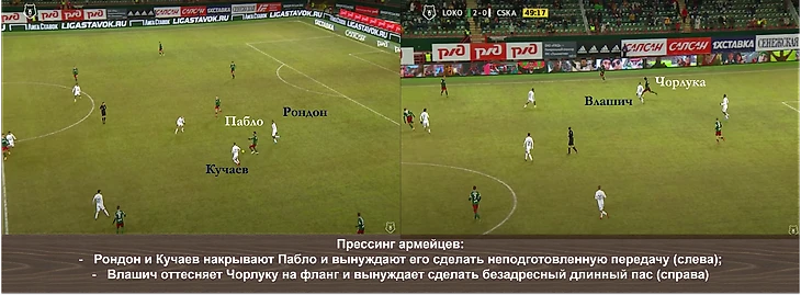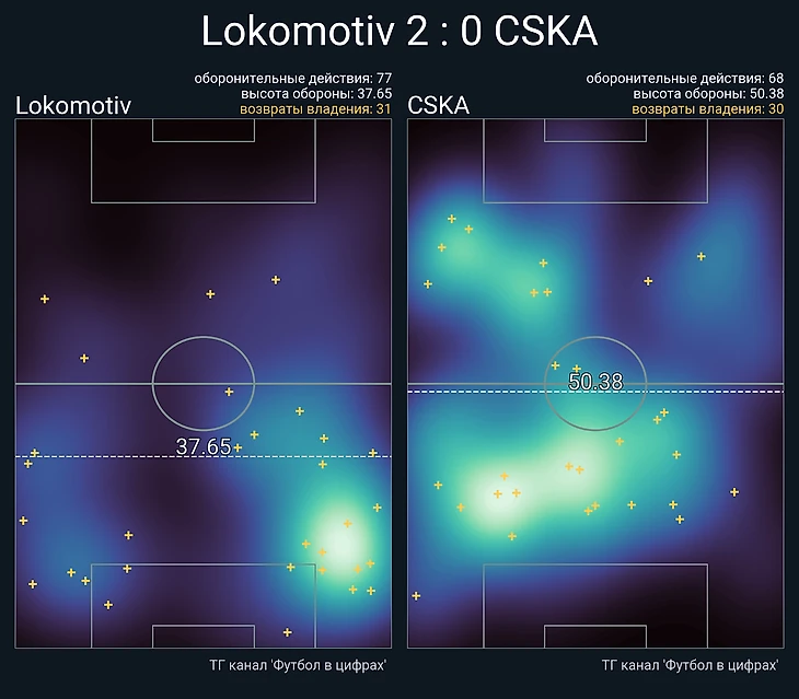Армейцы включили высокий прессинг: совершили 3 успешных оборонительных действия в финальной трети за тайм и заставили "Локомотив" чаще выходить через безадресный длинный пас. Но как только стартовый запал армейцев немного спал, "Локо" начал успешно разбивать их прессинг через короткий пас.