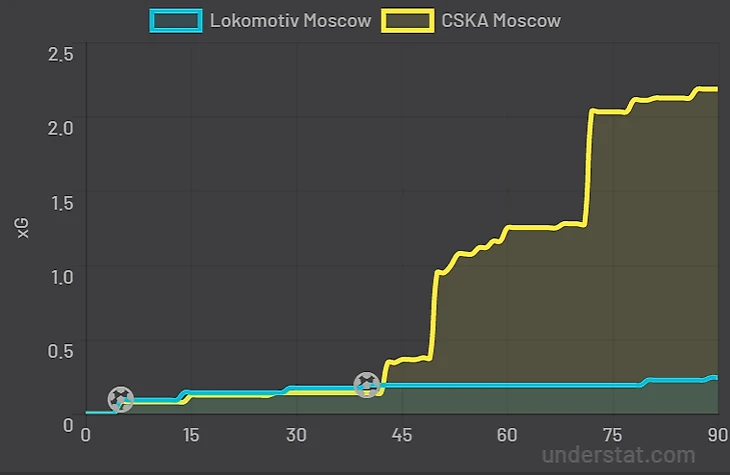 0.24 - 2.18 по xG в пользу армейцев - это тот самый случай, когда вне контекста голые цифры не значат ничего. Такой перевес сложился, главным образом, из двух эпизодов: нелепого пенальти (0.75) и сдвоенного момента Васина (0.26)/Кучаева (0.42) после заброса в противоход защитникам от Магнуссона.